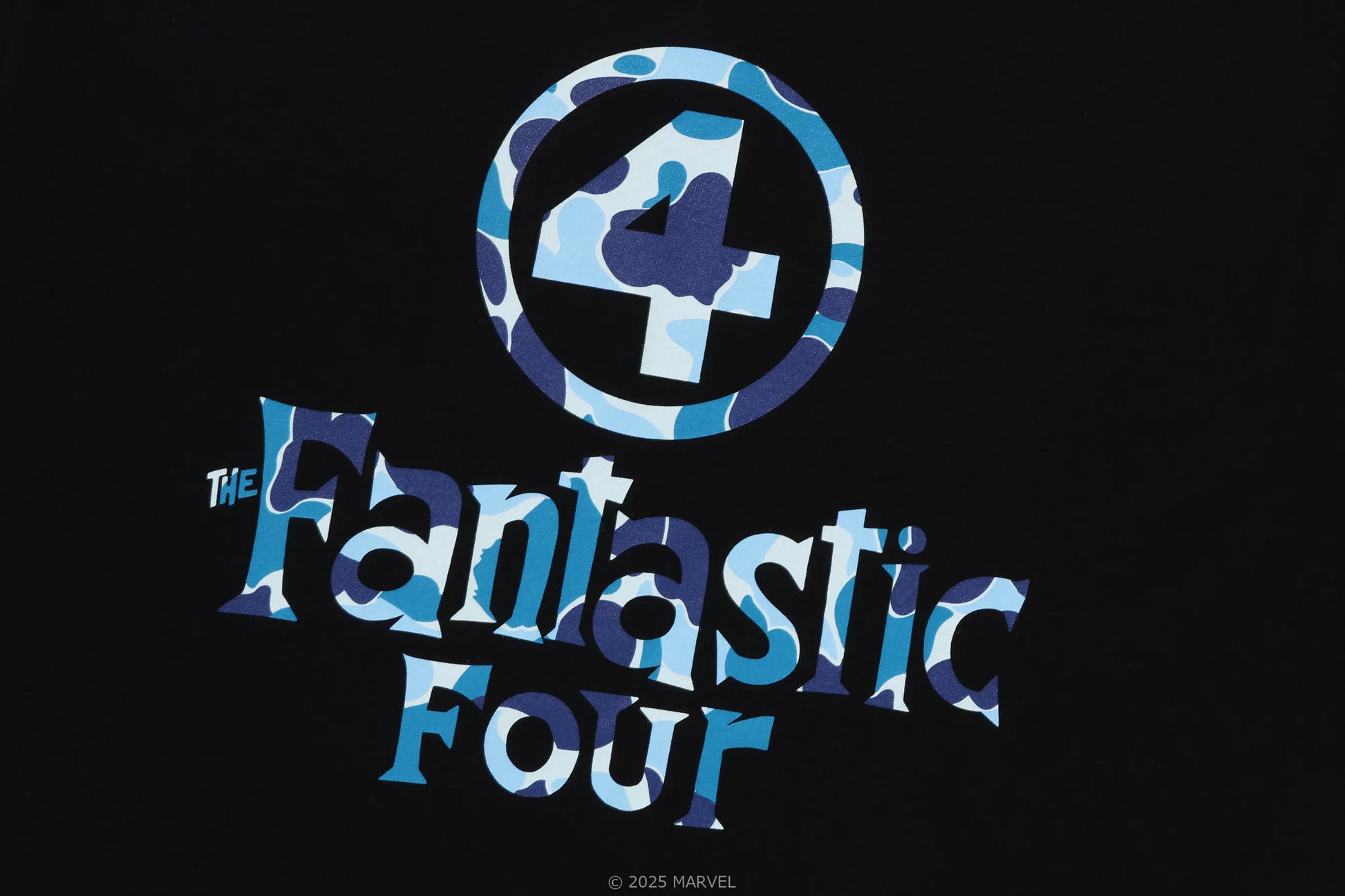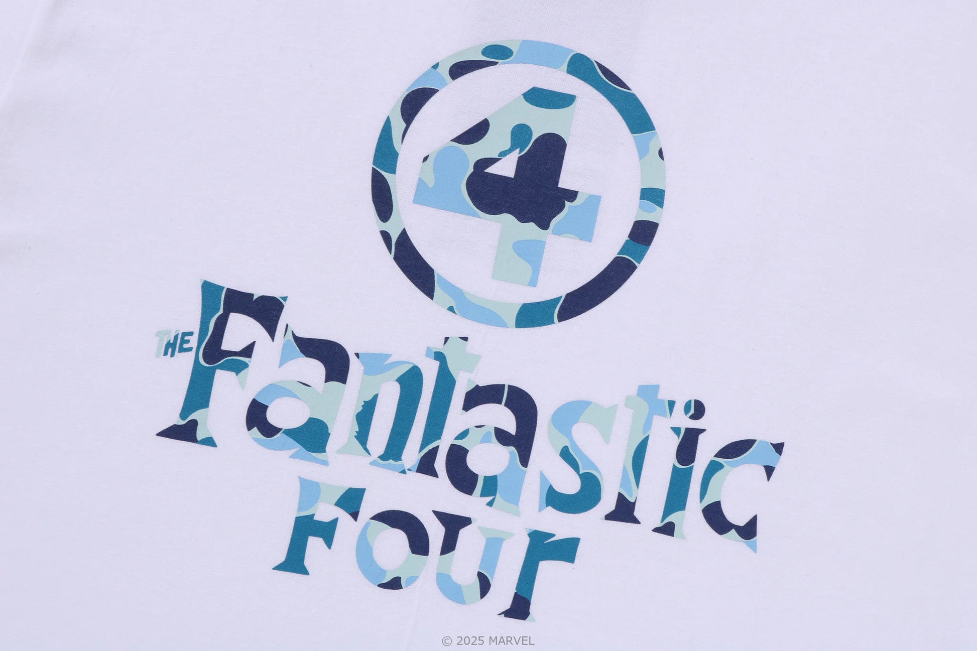Four T-shirt designs are available. The "LOGO TEE" reimagines the Fantastic Four logo in BAPE's signature ABC camo pattern. The "FANTASTIC FOUR TEE" also features team member characters in a single-color Solid Camo The lineup also includes the "GALACTUS & SILVER SURFER TEE," featuring Galactus and the Silver Surfer, combined with Solid Camo, and the "DR. DOOM TEE," combining Doctor Doom with Solid Camo. Each design highlights the individuality of the characters while incorporating BAPE's street-inspired graphics.