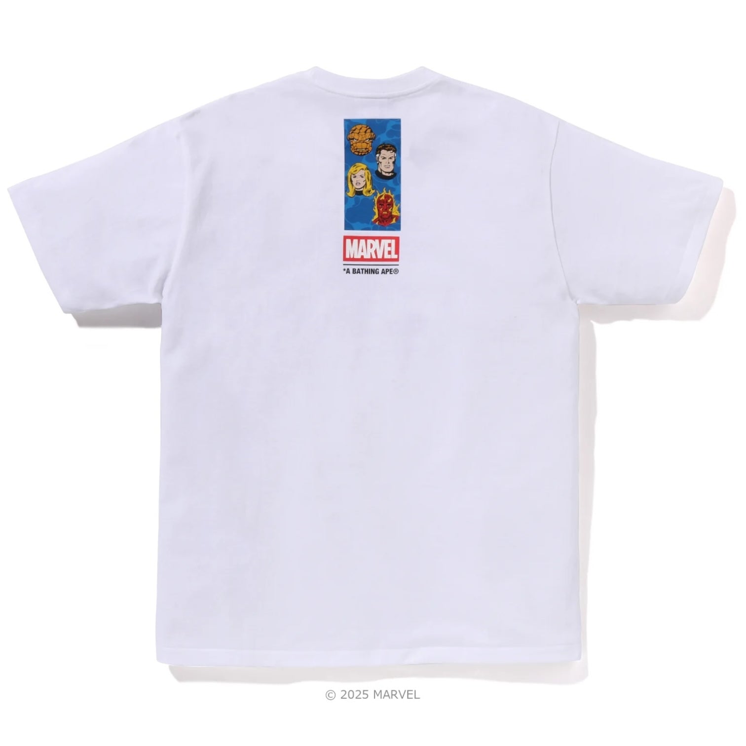 Four T-shirt designs are available. The "LOGO TEE" reimagines the Fantastic Four logo in BAPE's signature ABC camo pattern. The "FANTASTIC FOUR TEE" also features team member characters in a single-color Solid Camo The lineup also includes the "GALACTUS & SILVER SURFER TEE," featuring Galactus and the Silver Surfer, combined with Solid Camo, and the "DR. DOOM TEE," combining Doctor Doom with Solid Camo. Each design highlights the individuality of the characters while incorporating BAPE's street-inspired graphics.