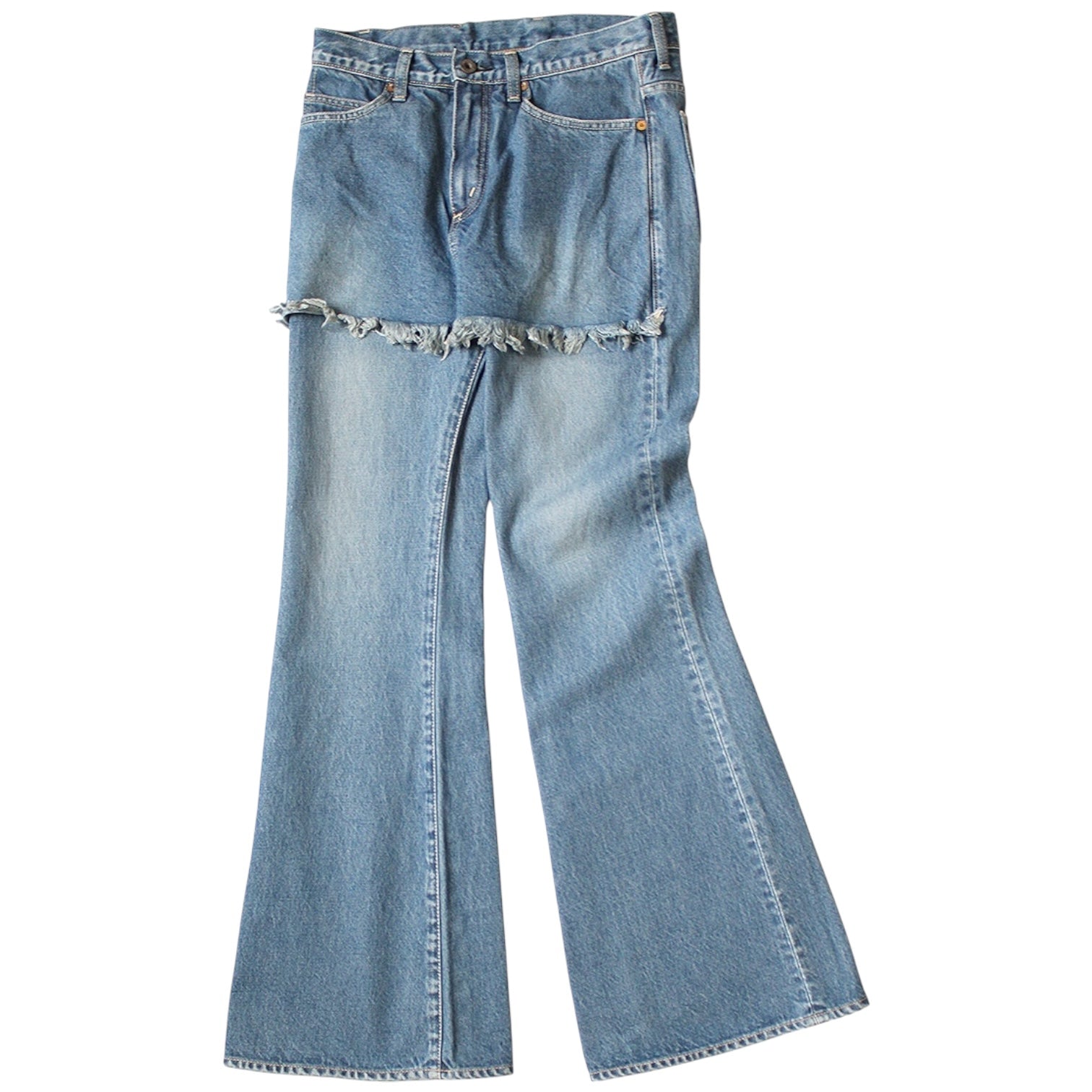 These pants are made from 14oz denim with a secondhand finish. The skirt part of the Scouser is only on the front, creating a design that combines an apron and a Scouser. They feature a deep rise and a flared silhouette. The skirt has raw hems.