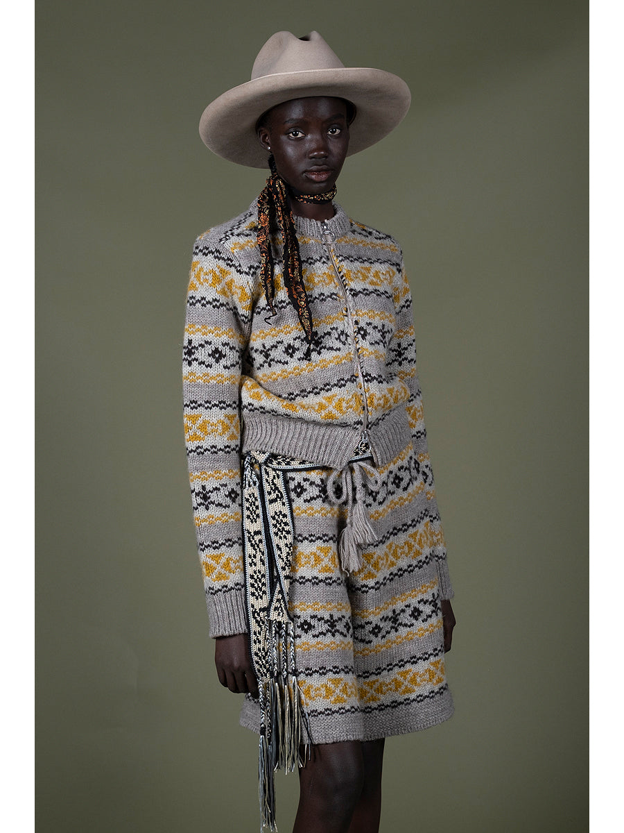 This short knit cardigan features a Fair Isle pattern. The double-zip front allows for versatile styling and creates a compact silhouette.