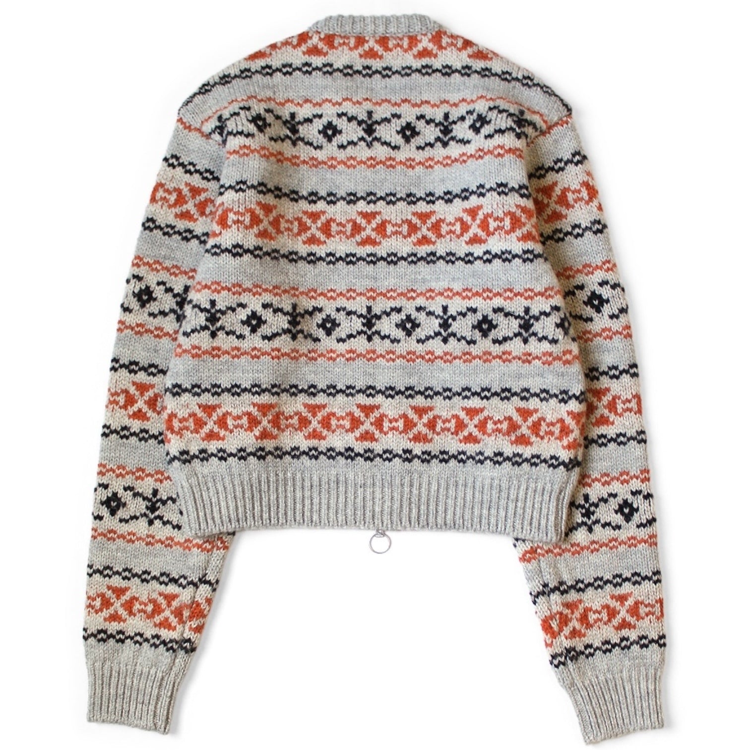 A short knit cardigan with a Fair Isle pattern. The double zipper front allows for a variety of styling options.