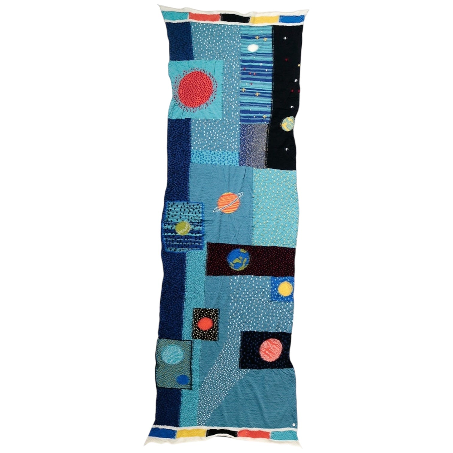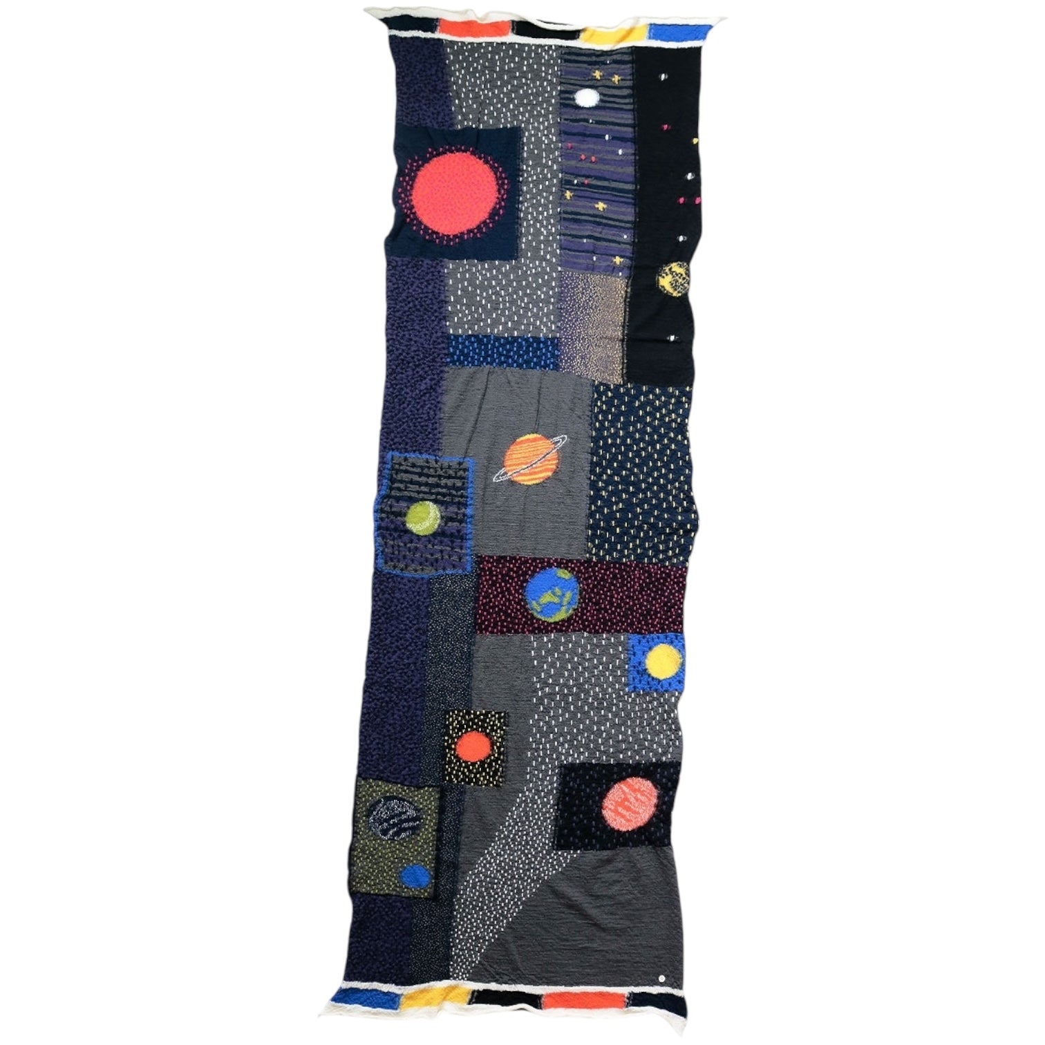 This fluffy wool scarf retains the simple and idyllic atmosphere of Gabbeh, while depicting warm sunlight and planets.