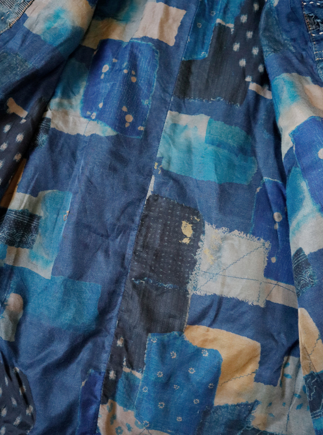 1ST jacket made with original fabric "BORO" that reproduces the shape of a rag. The lining of the body is made of a cupro and cotton blend fabric with a lintel print, creating an outerwear that is lightweight and comfortable to wear.