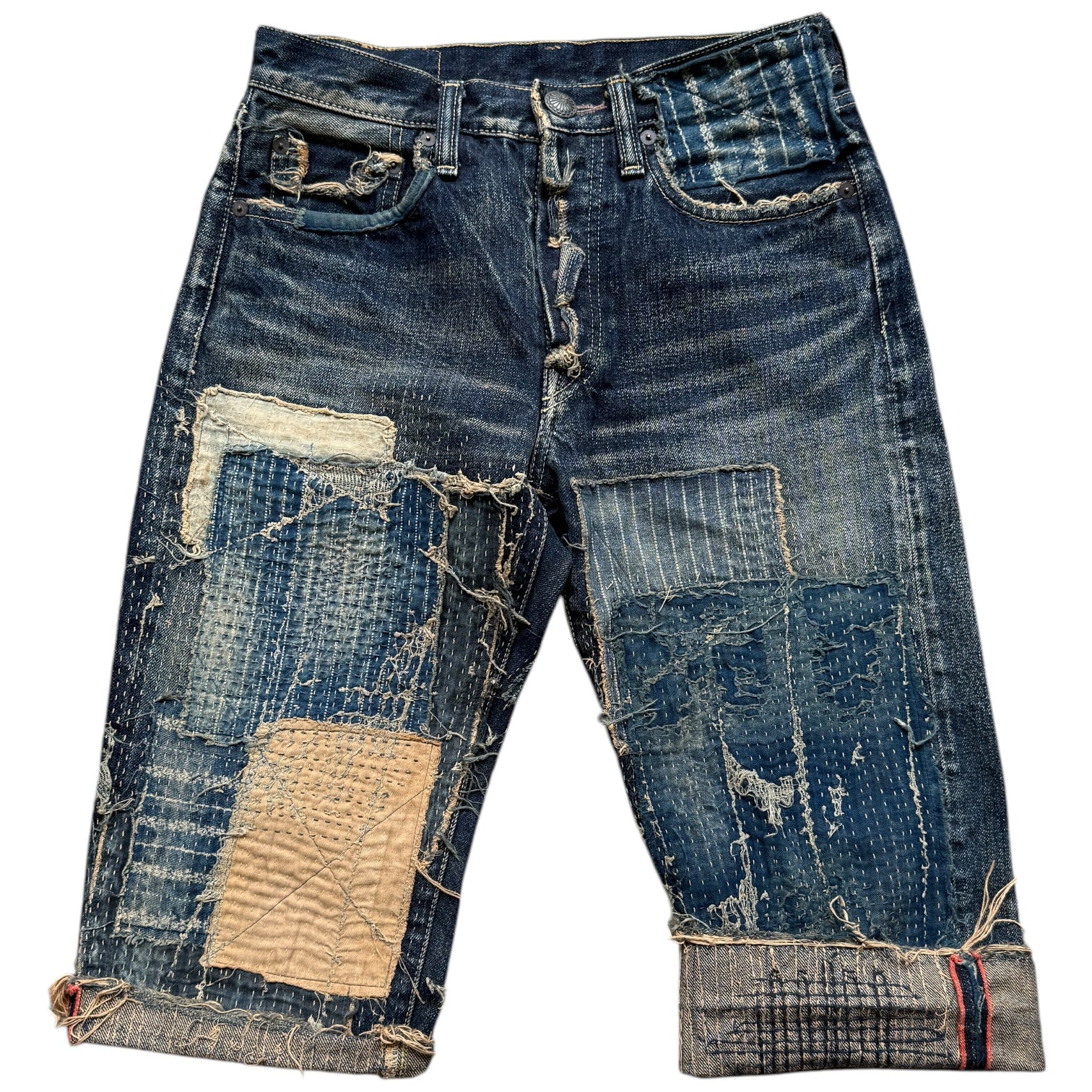 Kapital selvedge denim shorts that have been distressed and reconstructed extensively using traditional boro techniques. Sashiko stitching is used throughout the garment to attach additional pieces of fabric. Silver plated hardware is used for buttons.