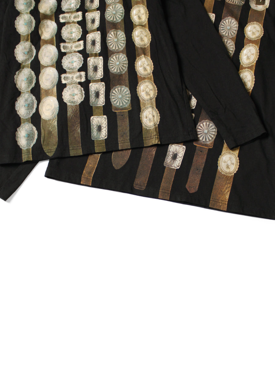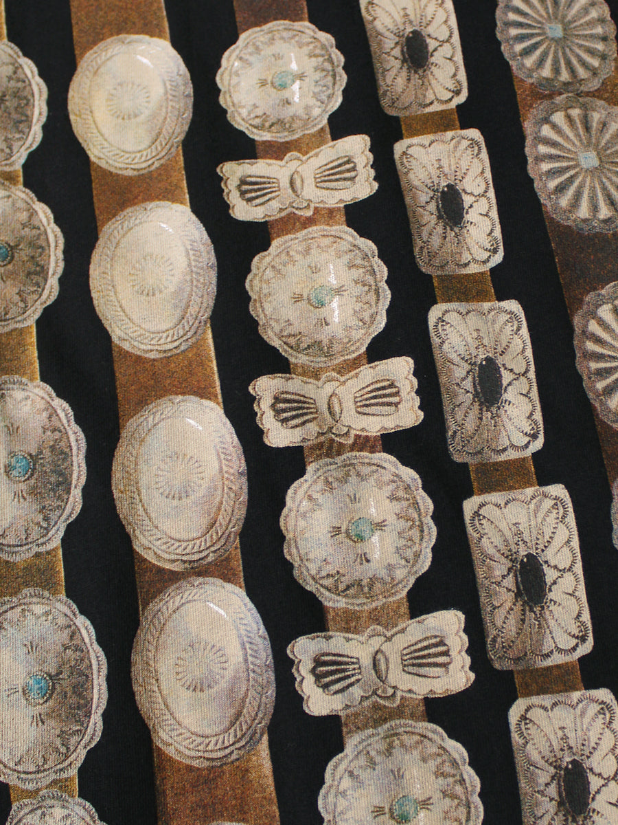 A crew neck tee featuring a curtain-like print of vintage concho belts.