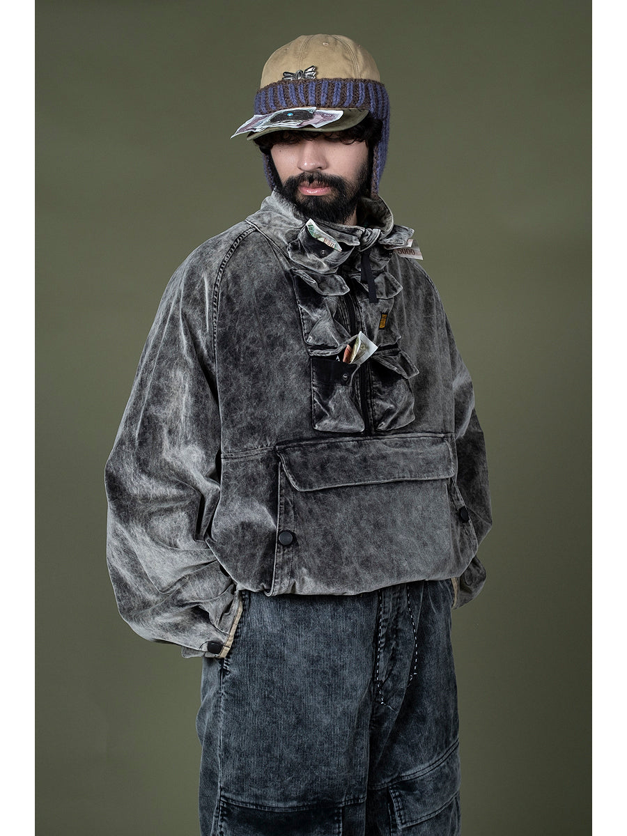 This anorak is made from unevenly dyed velveteen fabric. There are six mini pockets next to the half zipper, and a zippered pocket with a flap is attached to the front. The back and sleeves have been tucked to create a relaxed, three-dimensional silhouette that hugs the body. The cord at the hem allows for precise adjustments to the silhouette.