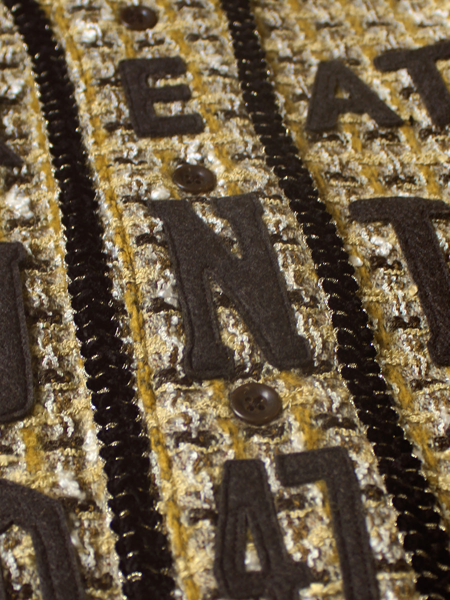 A long-sleeved baseball shirt made from luxurious, three-dimensional fancy tweed fabric. It has a simple, slightly wide silhouette and features a felt KOUNTRY logo.