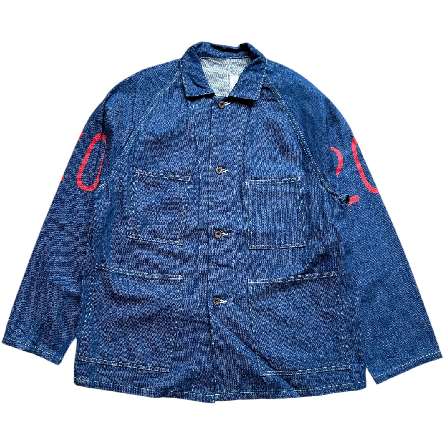 This is a light coverall type jacket that was made to commemorate the 20th anniversary of the Kapital store in Kobe (Now closed). A hand written message lines the interior, recognizing the store's milestone. The number 20 is embroidered throughout the piece, with the 0 made into a peace sign.