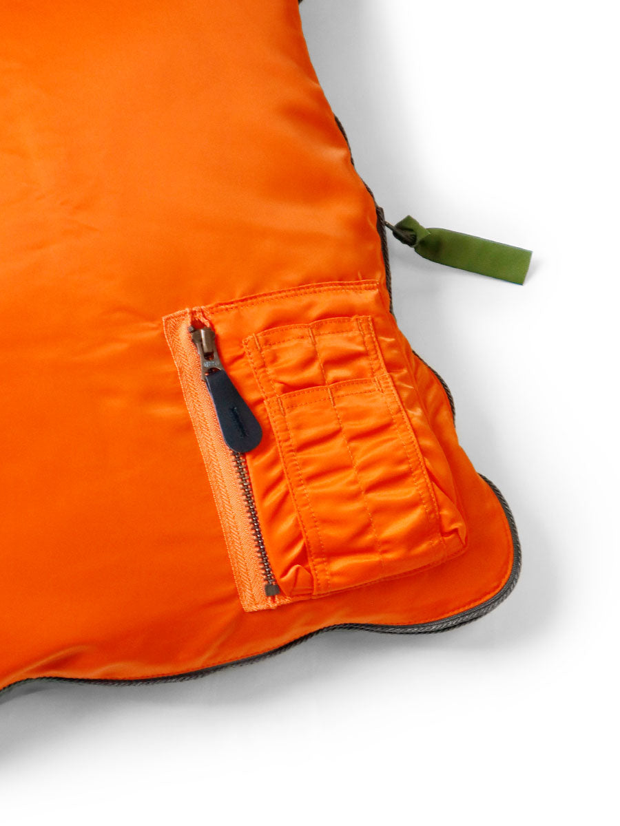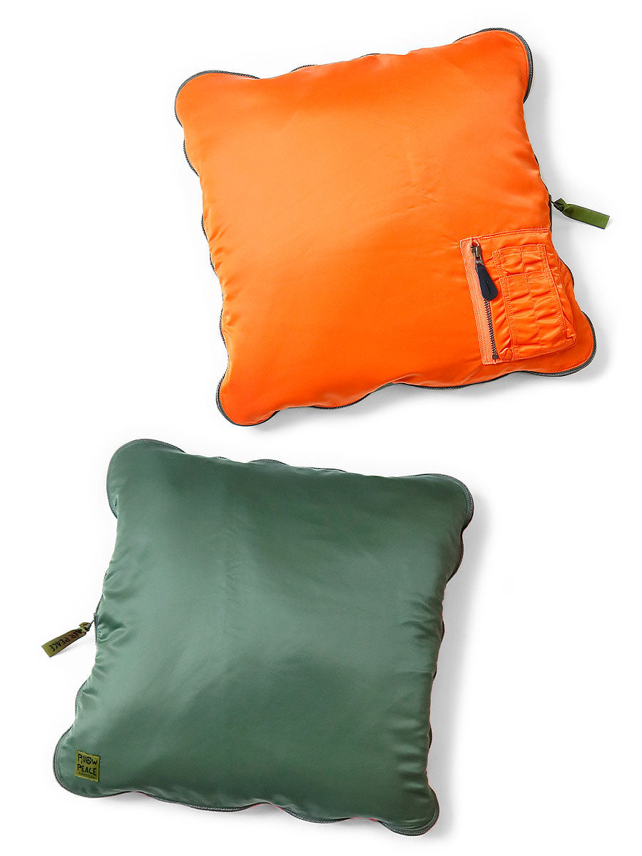 This functional bomber jacket can be transformed from a jacket to a cushion. Crafted from durable, lustrous nylon fabric, it comes in classic military colors. The voluminous silhouette is accented by the shoulder cushioning. Simply open the side zipper, fold the sleeves inward along the cushioning surface, and fold the body back and close it to transform into a cushion.