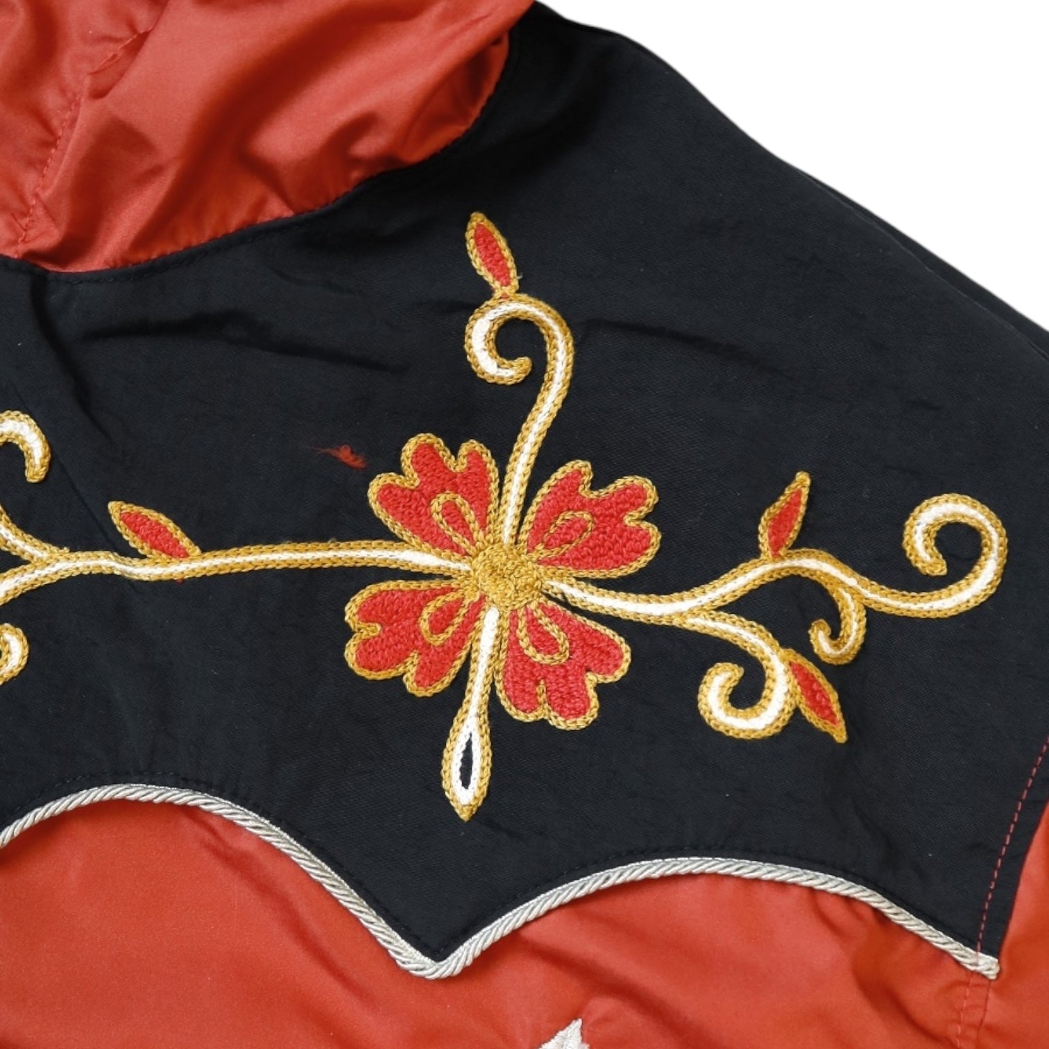A 2-tone design hoodie made from 100% polyester taffeta fabric that is smooth to the touch. The lining is made of mesh material. The fabric switching and floral motif embroidery are inspired by western shirt designs. The collar and hem adjusters allow you to wear it in a variety of ways.
