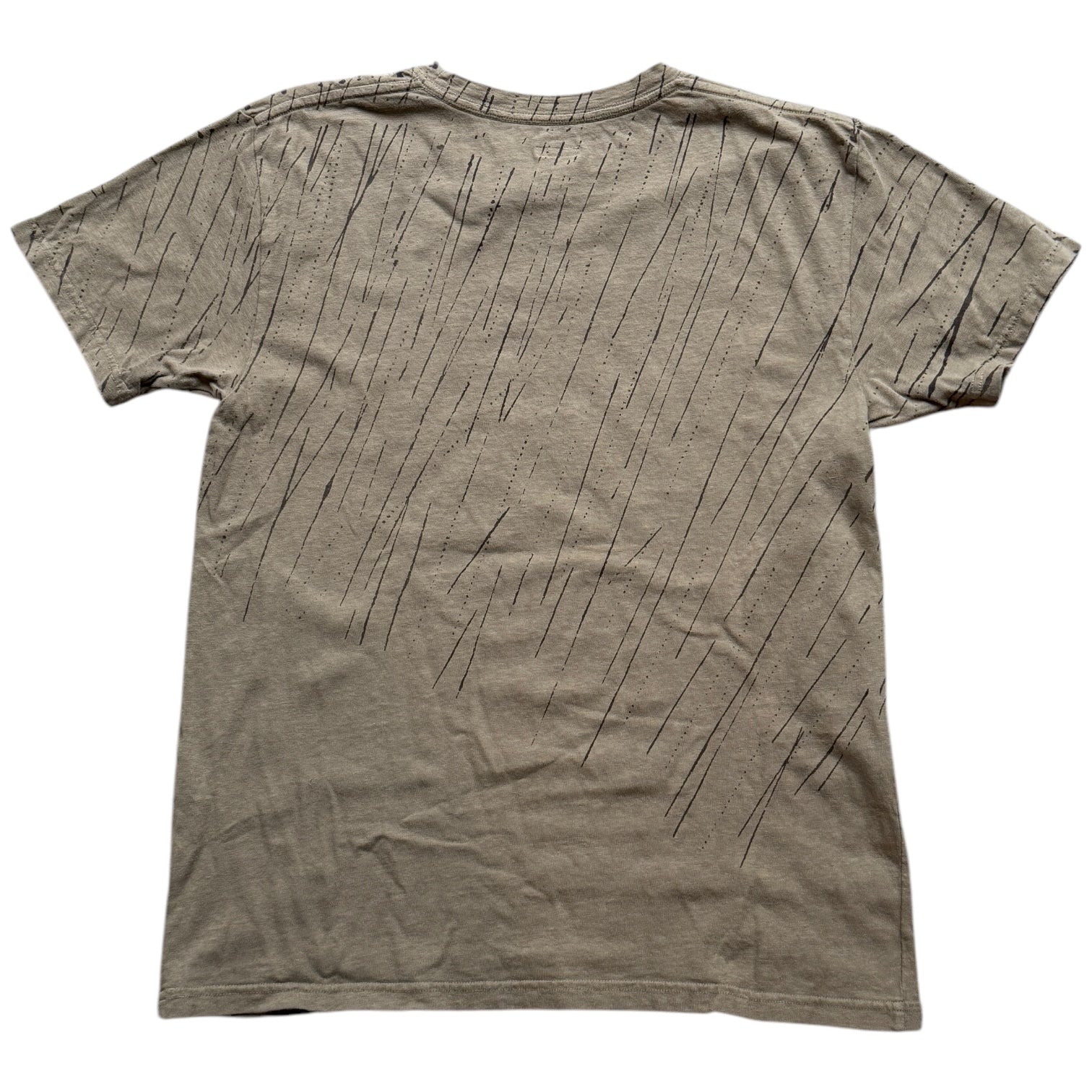 A kahki colored rain camo t-shirt with a hue Rainbowy printed on the left chest.