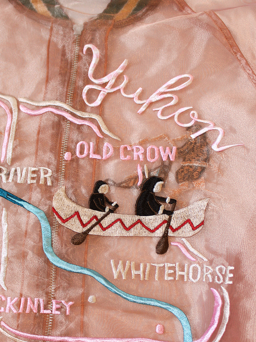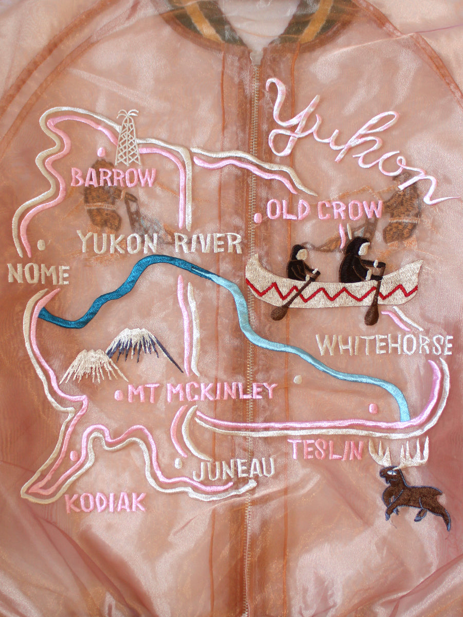 This jacket is made of a translucent sheer material that allows you to see through it. It has just the right amount of tension and sheen, and feels smooth against the skin. This voluminous souvenir jacket has been redesigned to be light and refreshing to wear. The back is embroidered with a design depicting the Alaska & Yukon region of North America. It comes with a storage bag.
