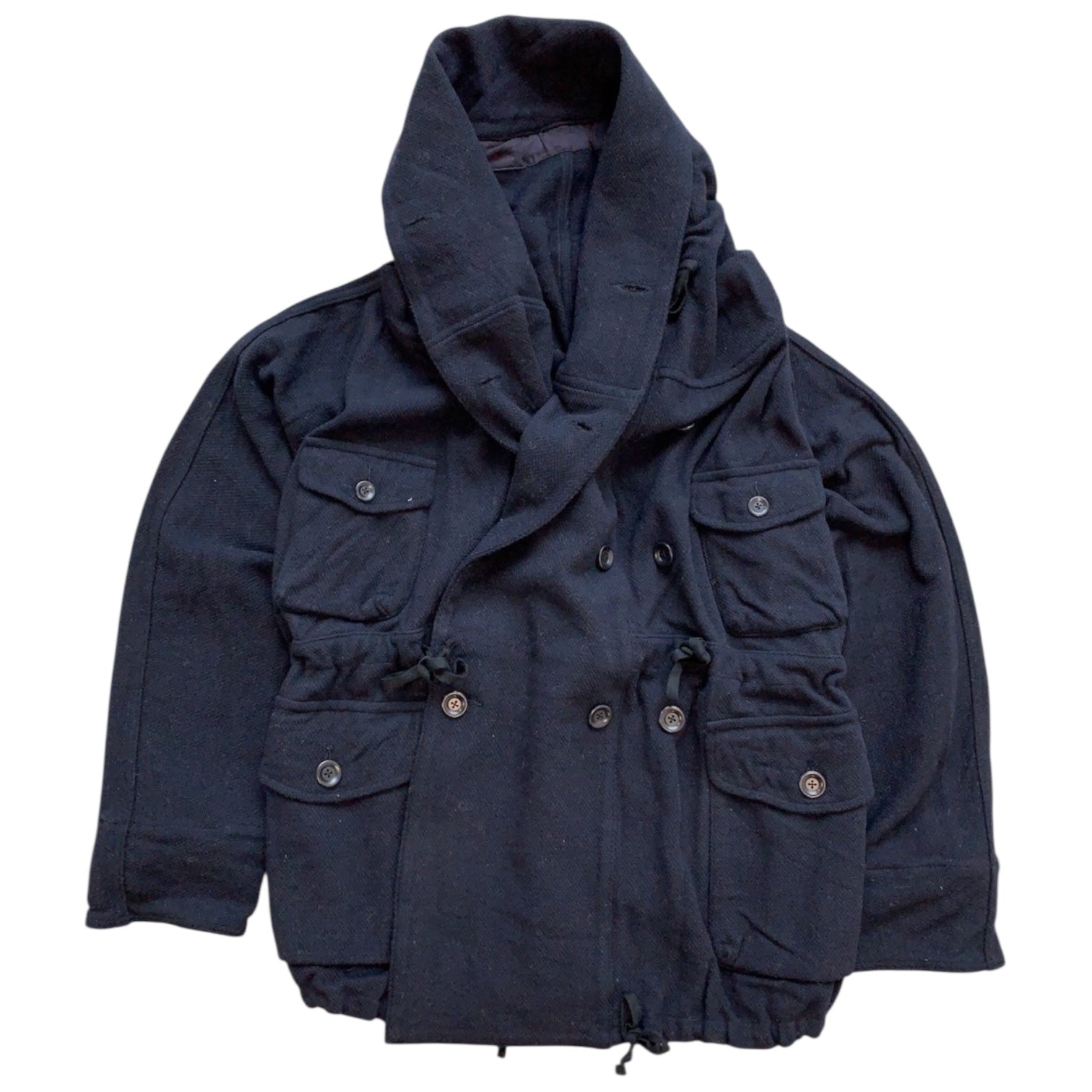 A wool ring coat that can be worn in a variety of ways using the buttons and front bib. It has a voluminous silhouette, and the waist can be adjusted with a string.