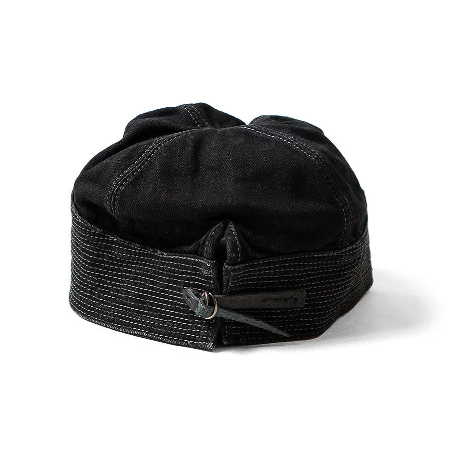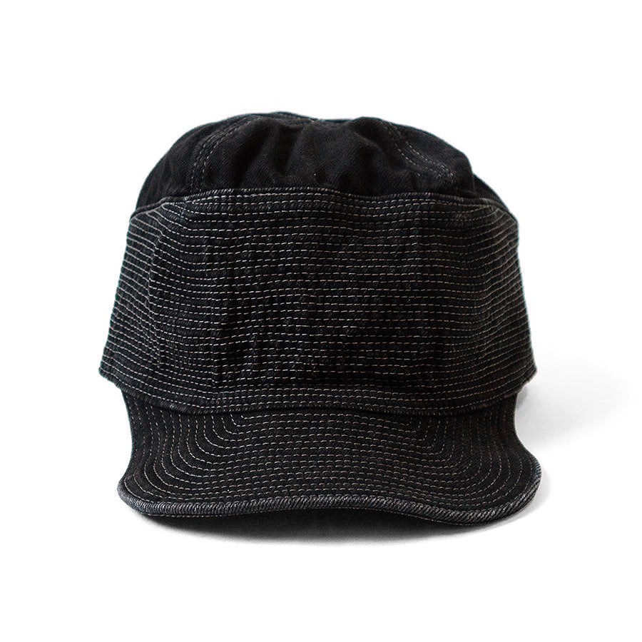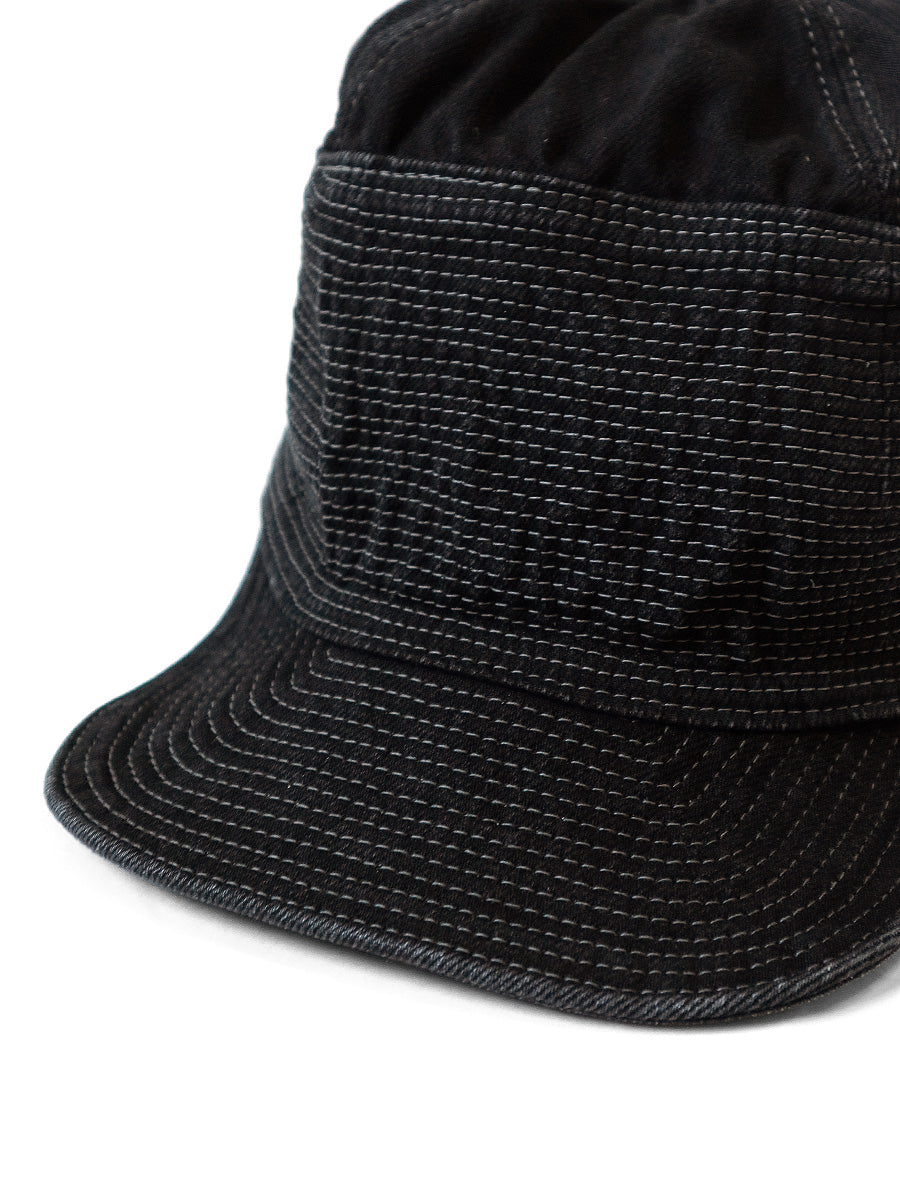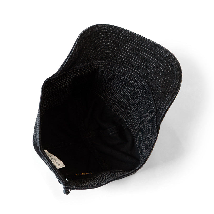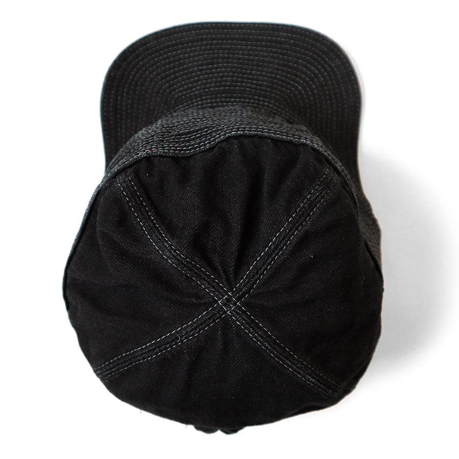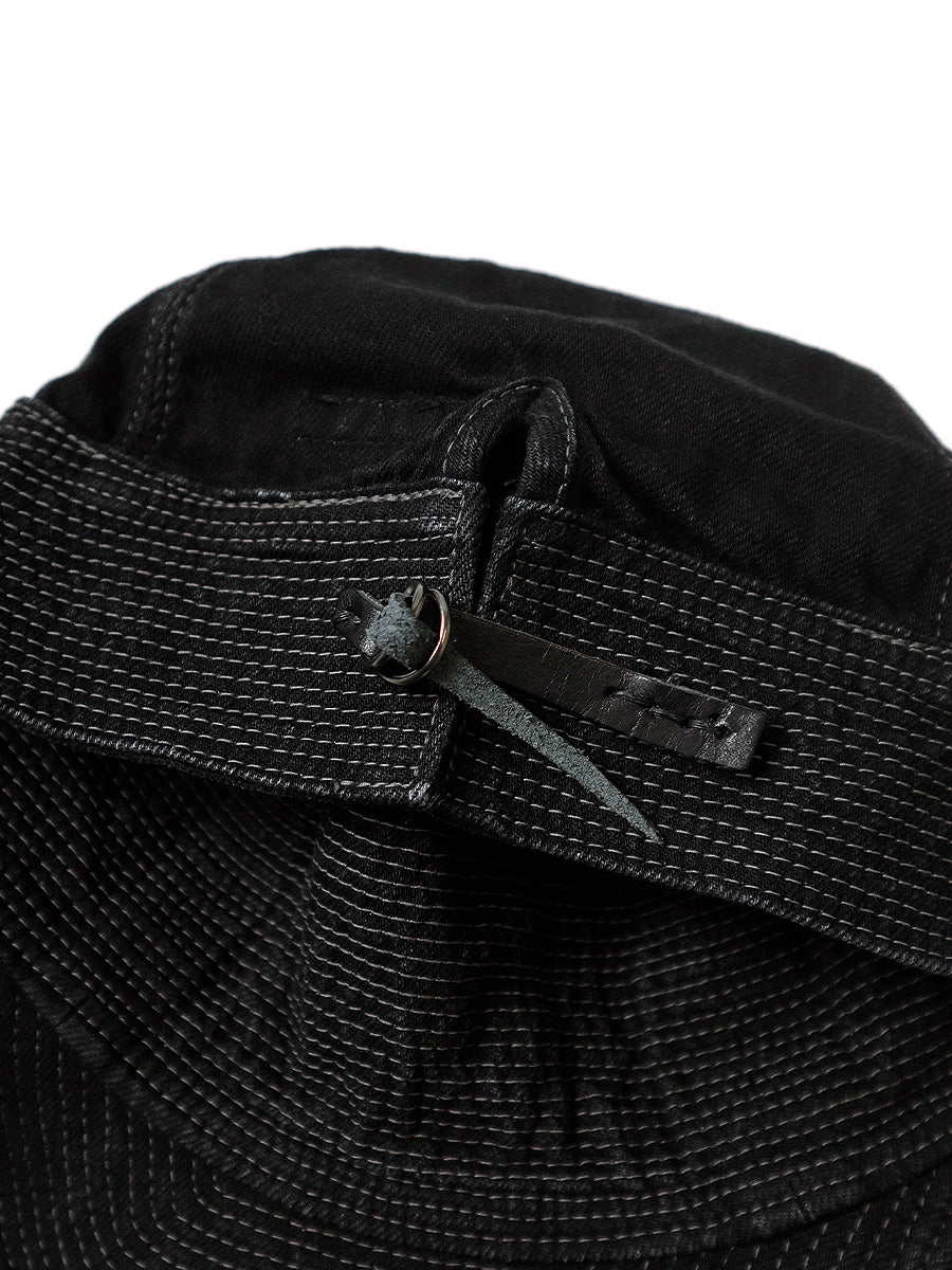 This black denim Old Man & The Sea Cap is woven using black-dyed yarn for both the warp and weft. The countless stitches that cover the entire brim and more than half of the crown serve as both reinforcement and decoration.
