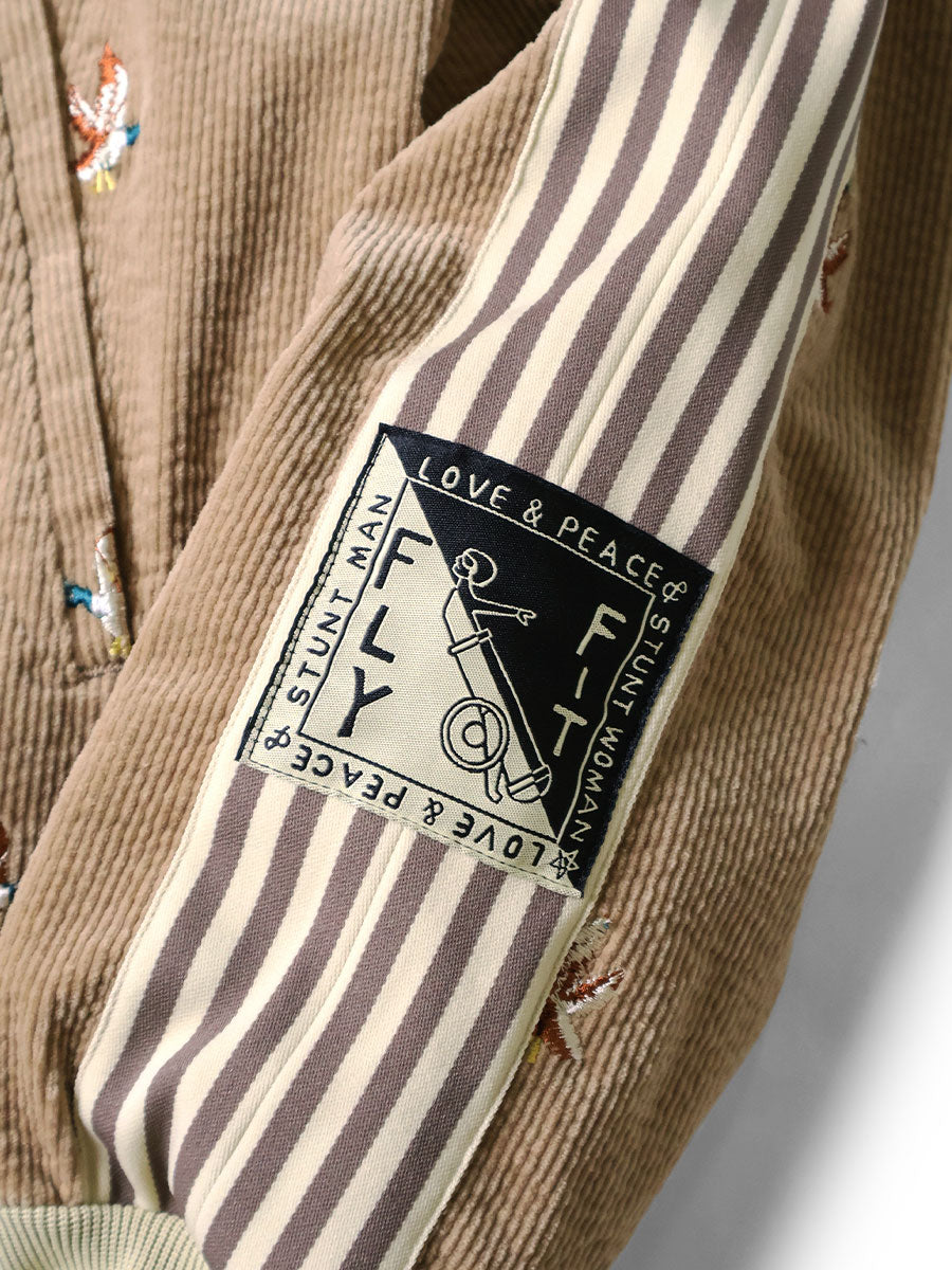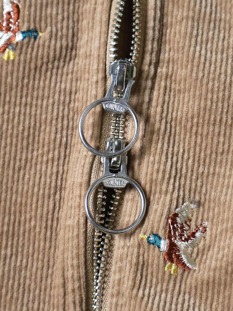 This track jacket is made of stretch corduroy with an all-over duck embroidery pattern, striped tape on the sides, and a double zip.