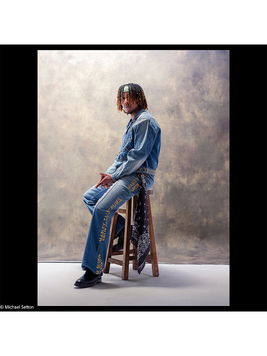 These pants are made from 12oz denim with a distressed finish. The bootcut silhouette flares slightly from the knee to the hem. The title of a Bob Marley song is printed on the side with a faded texture. The design features pin tucks.