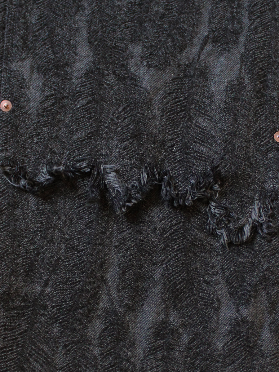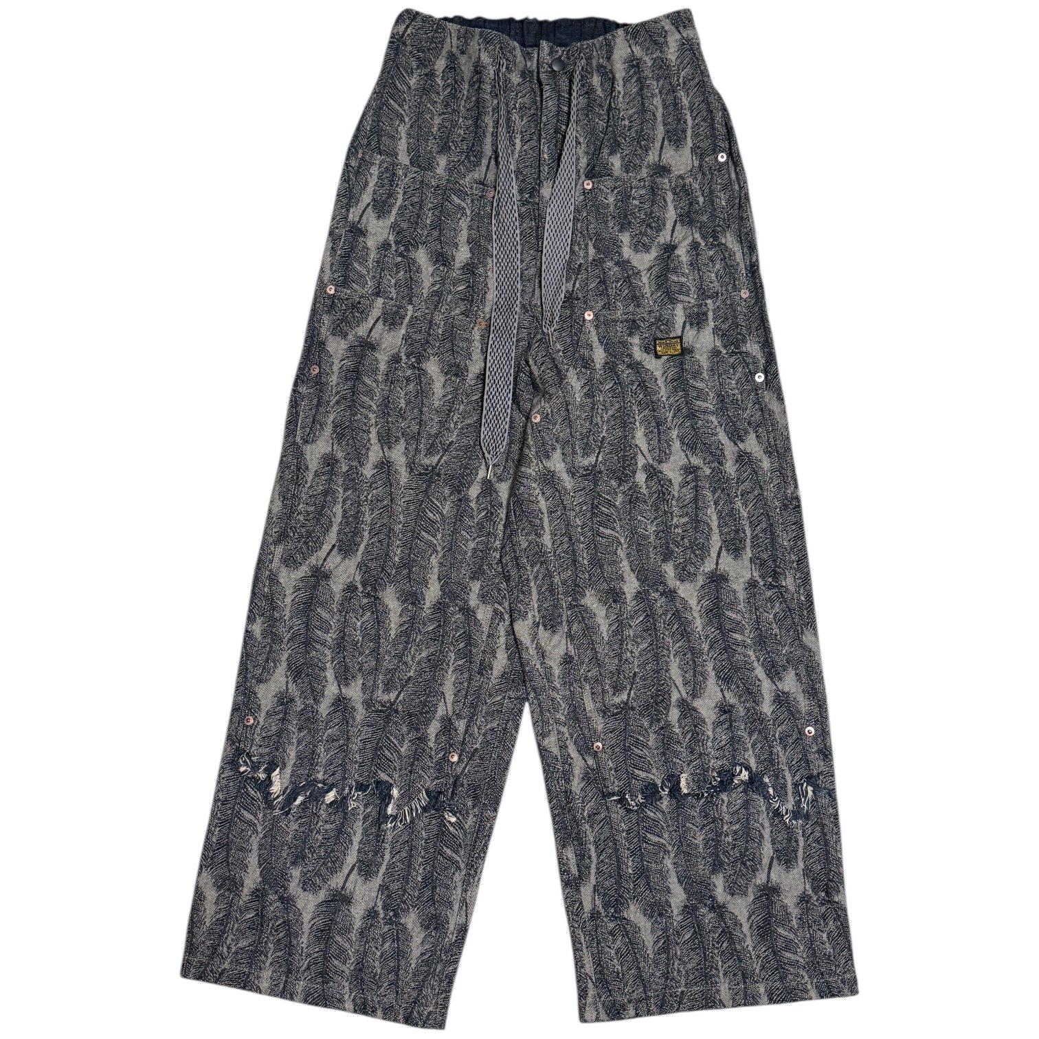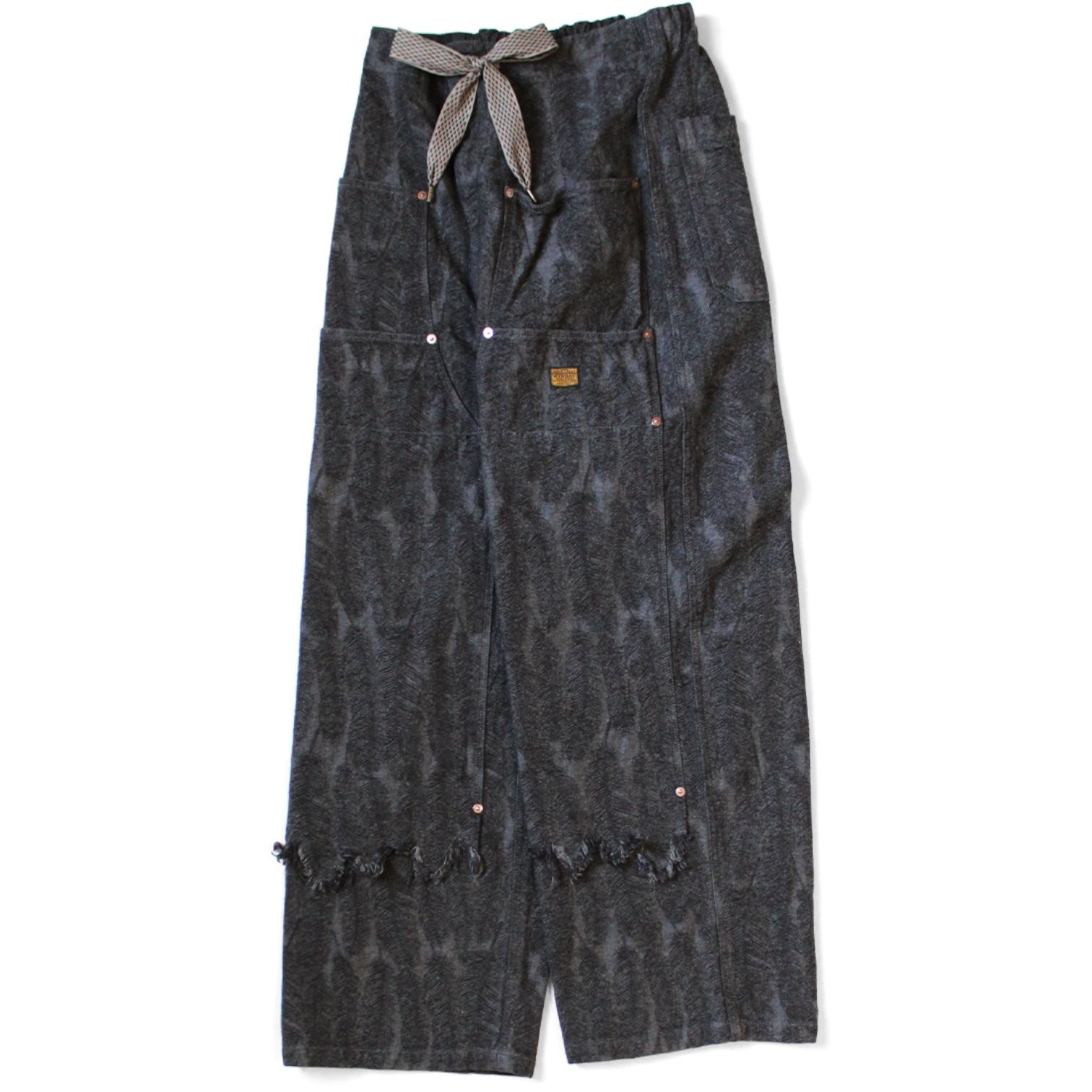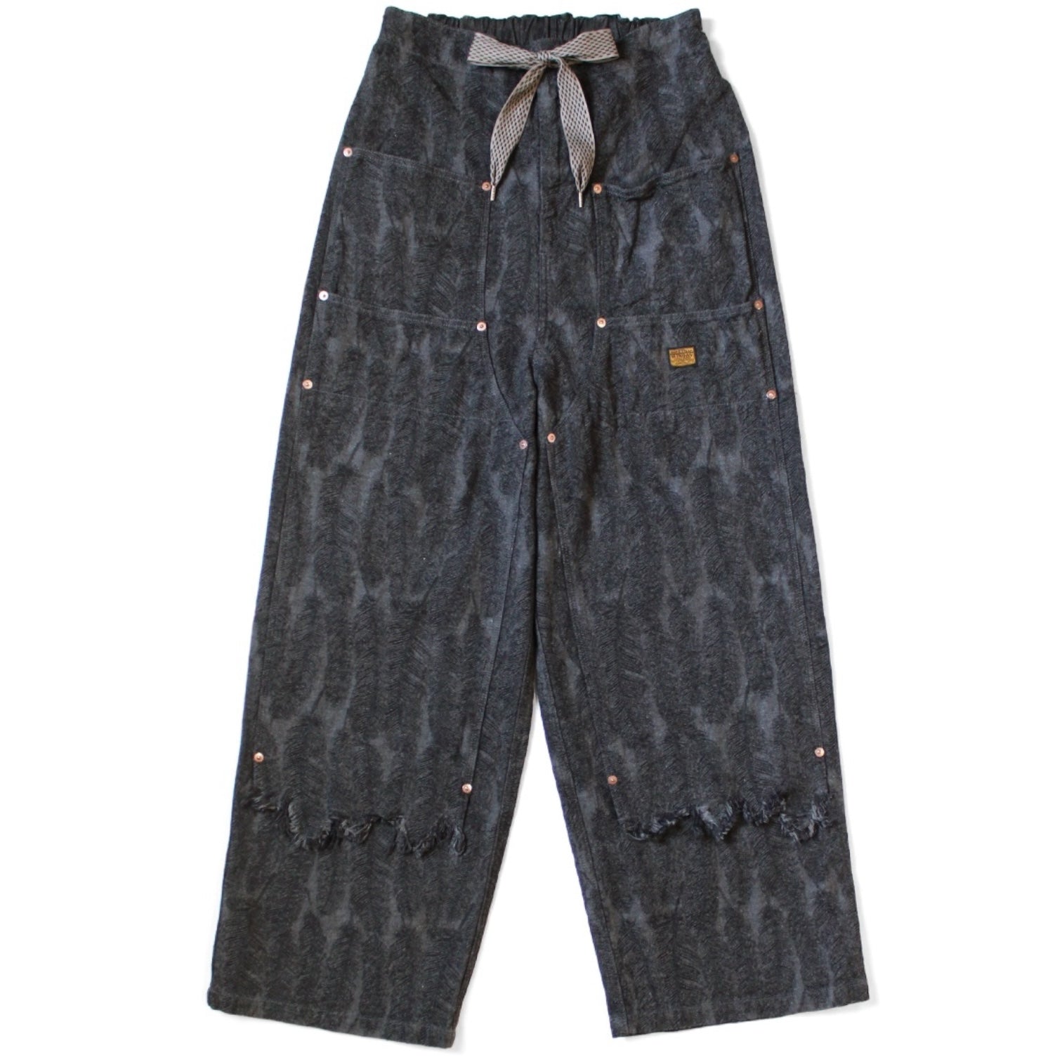 These pants have a double knee design and are made of 12oz jacquard denim. It expresses the beautiful feathers of a magpie in three dimensions. The waist is made of elastic and drawstring for an accommodating fit. The ends of the double knee patch are raw, expressing the light feel of feathers.