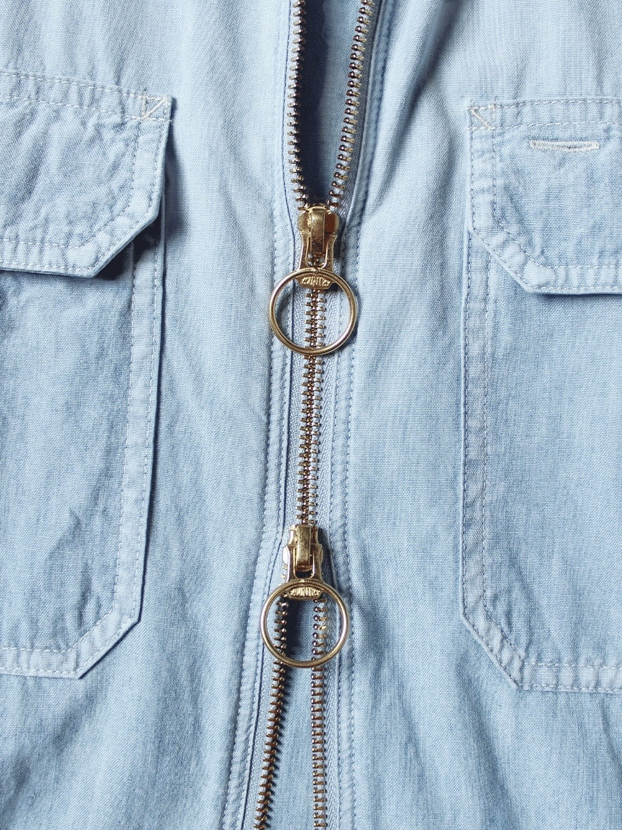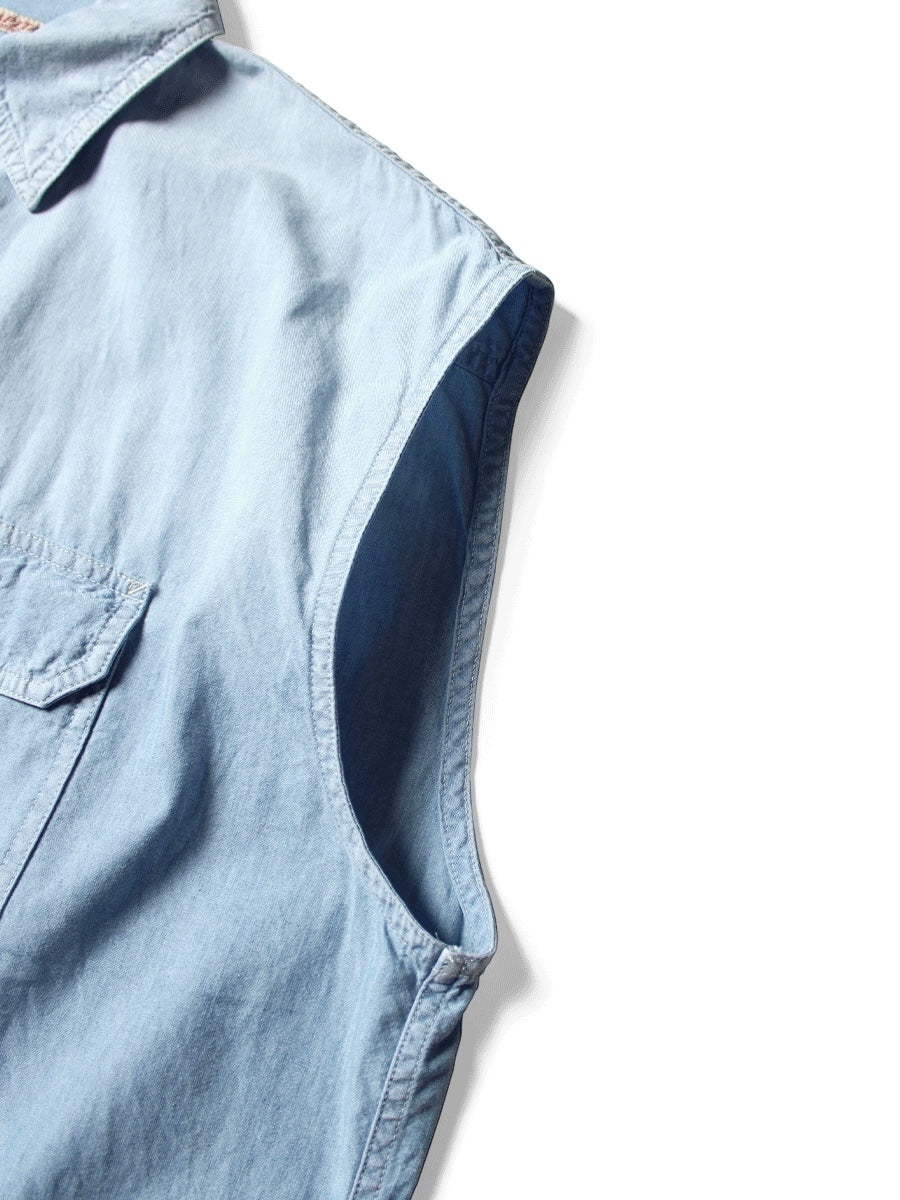 A sleeveless work shirt made from refreshing chambray fabric. It features a double zipper on the front and a chest pocket. It has a loose silhouette with a wide body and armholes.
