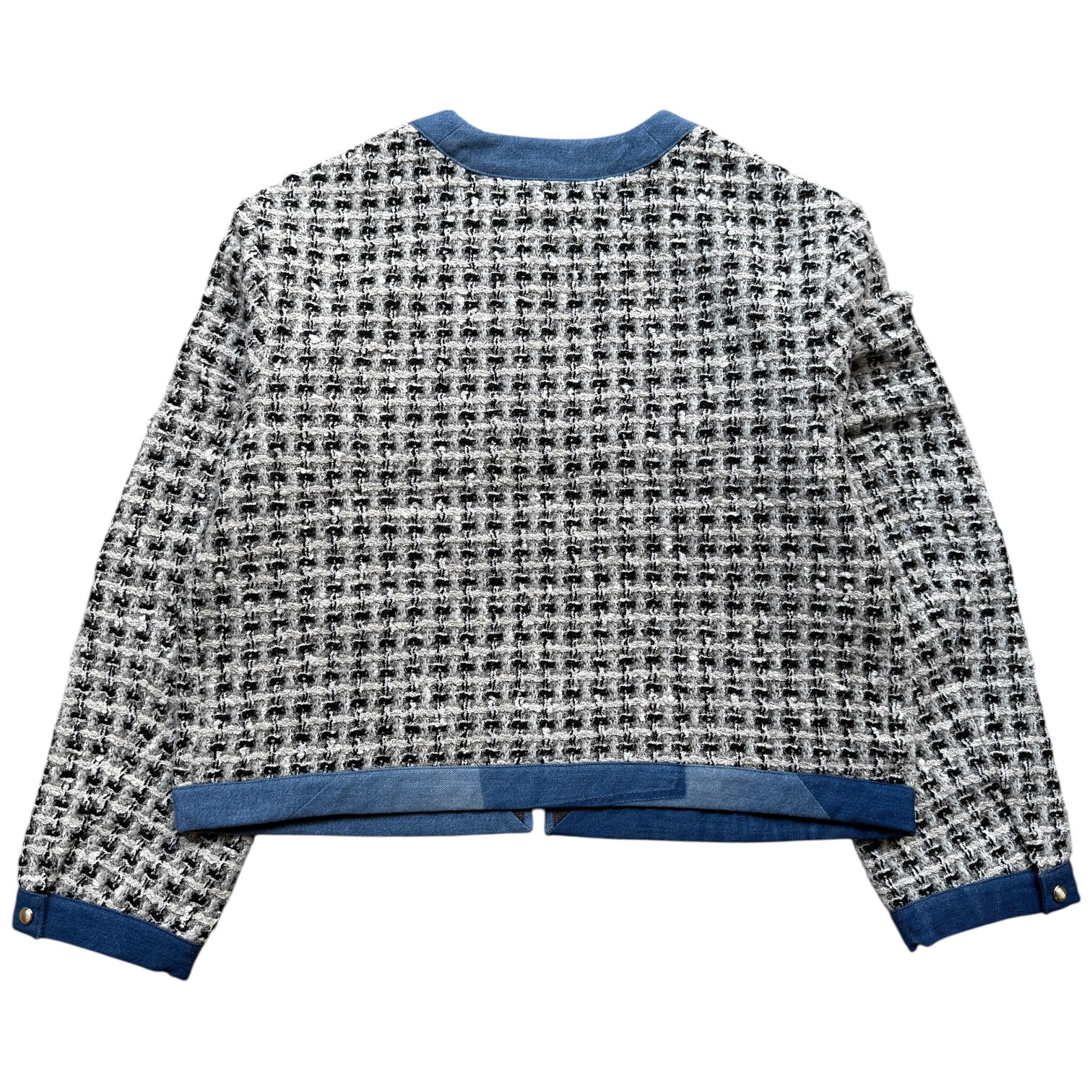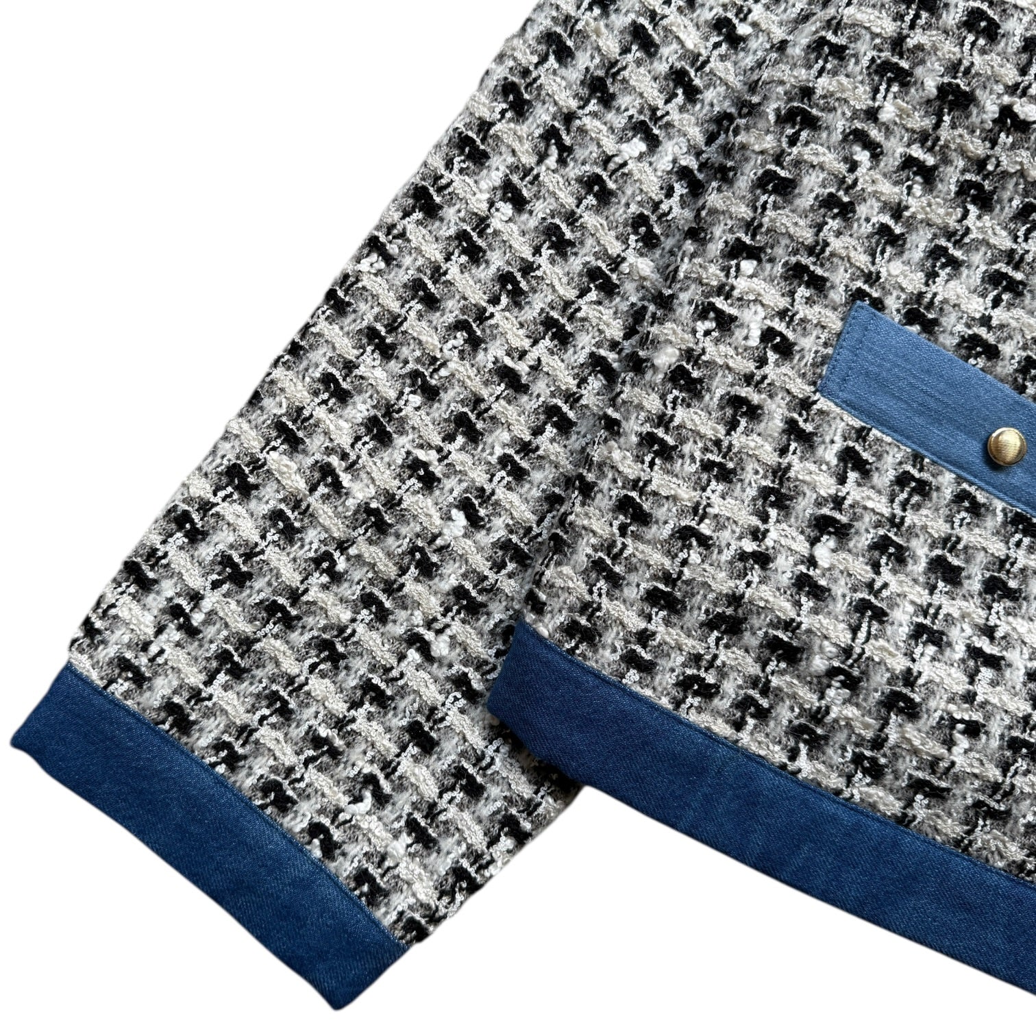 A short-length bolero jacket made of fancy tweed fabric. The fabric has a three-dimensional feel, created by combining threads of different thicknesses. The cuffs, front pocket openings, and the area from the neck to the hem are switched to denim. It has a double zipper.