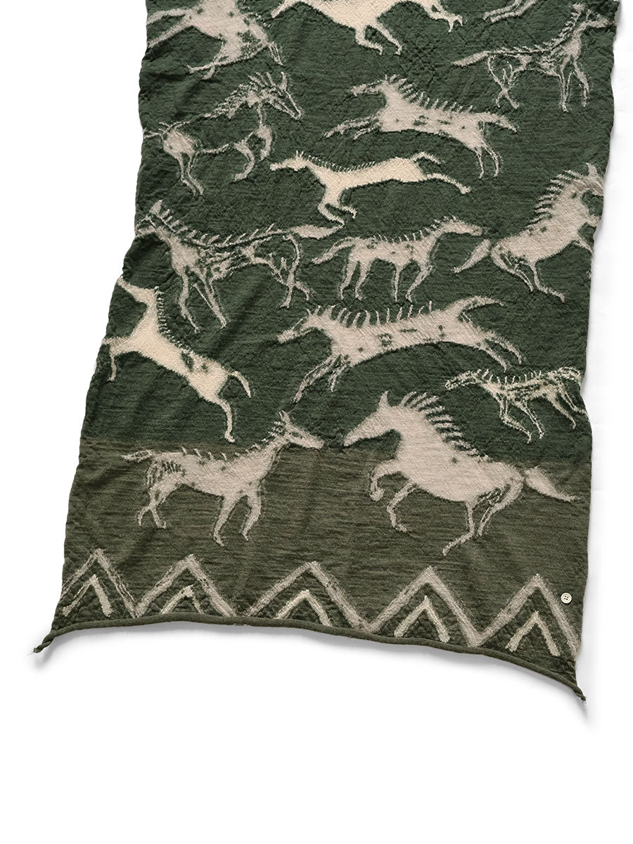 This fluffy, felted wool scarf is comfortable against the skin. It comes in a large, original size. It features a horse pattern painted using traditional Native American painting techniques.