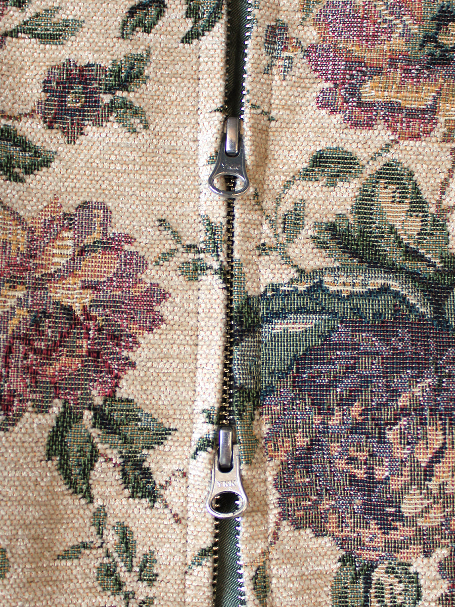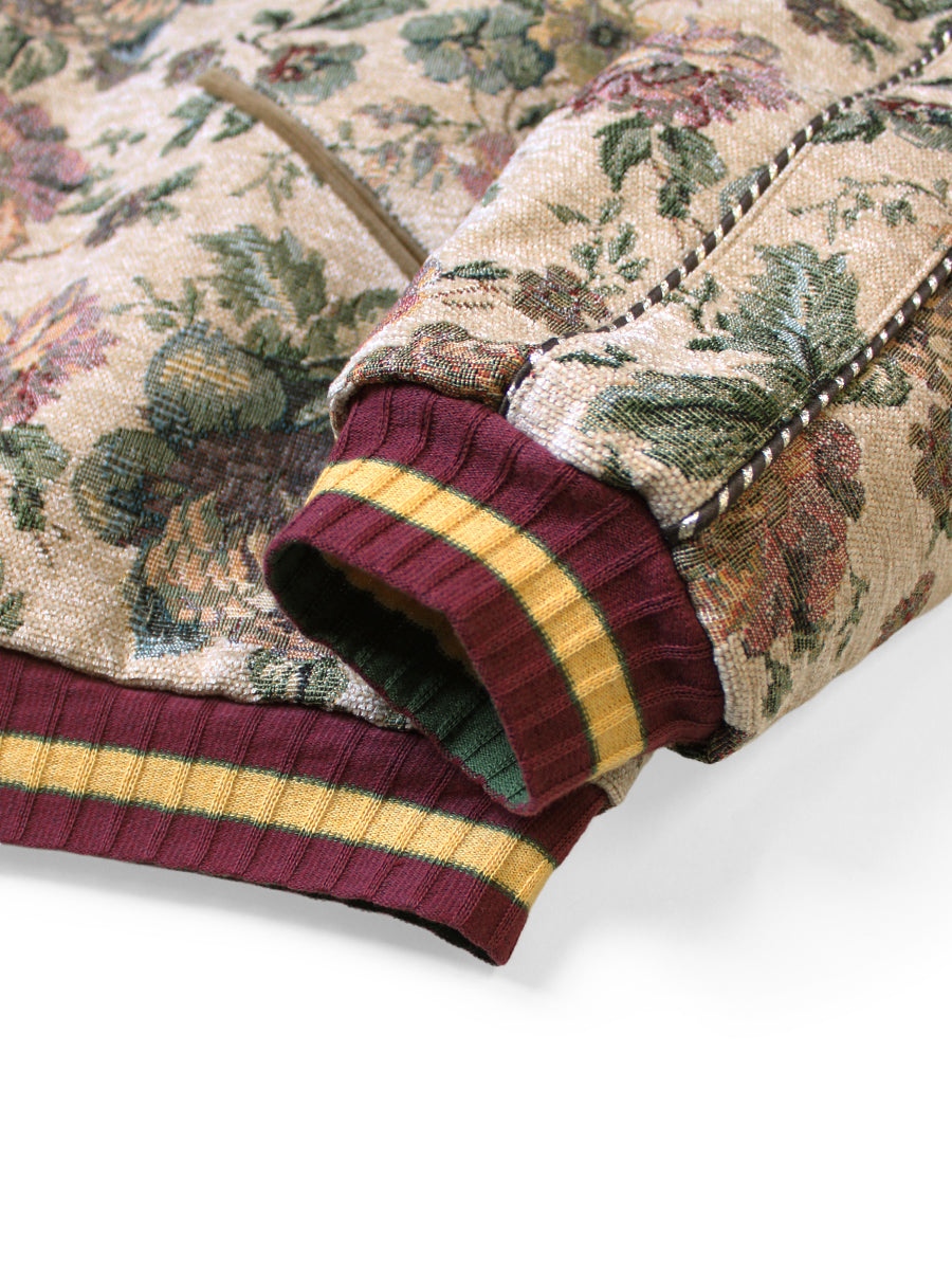 A souvenir jacket made from Gobelin fabric with a profound feeling and elegance. A map of Japan is the embroidered on the back. It is a voluminous silhouette with padding.