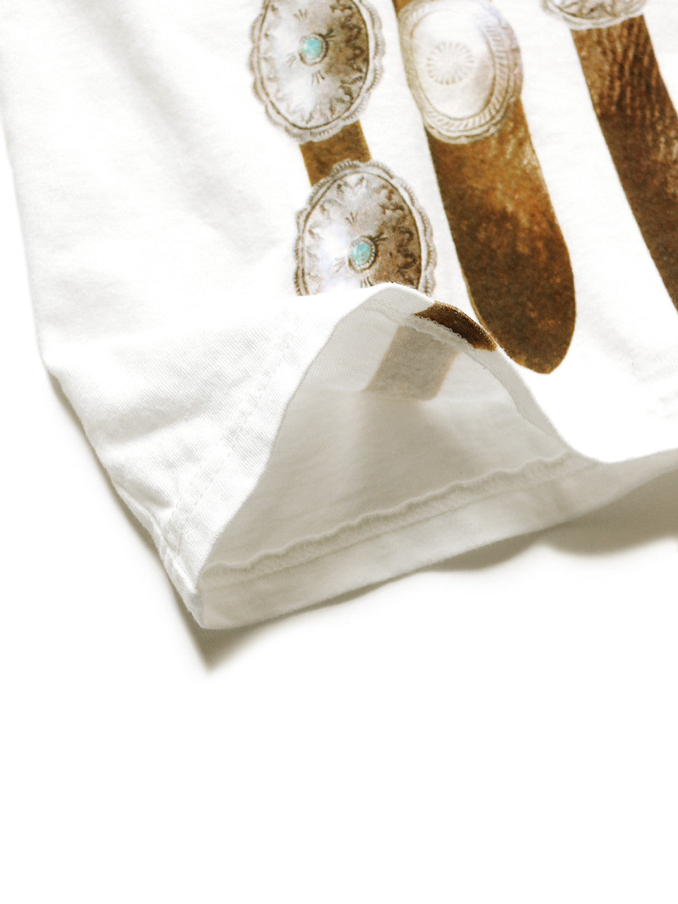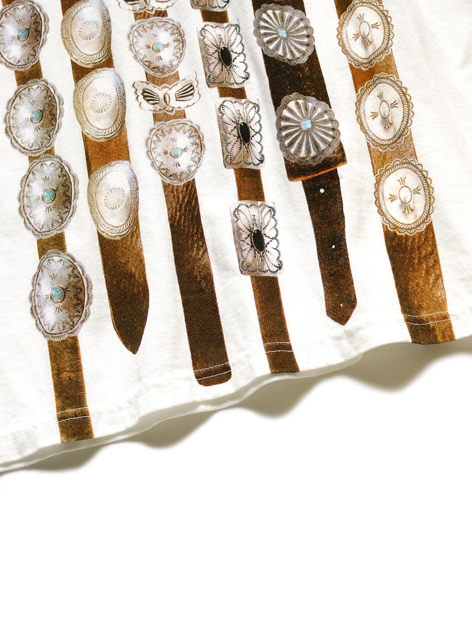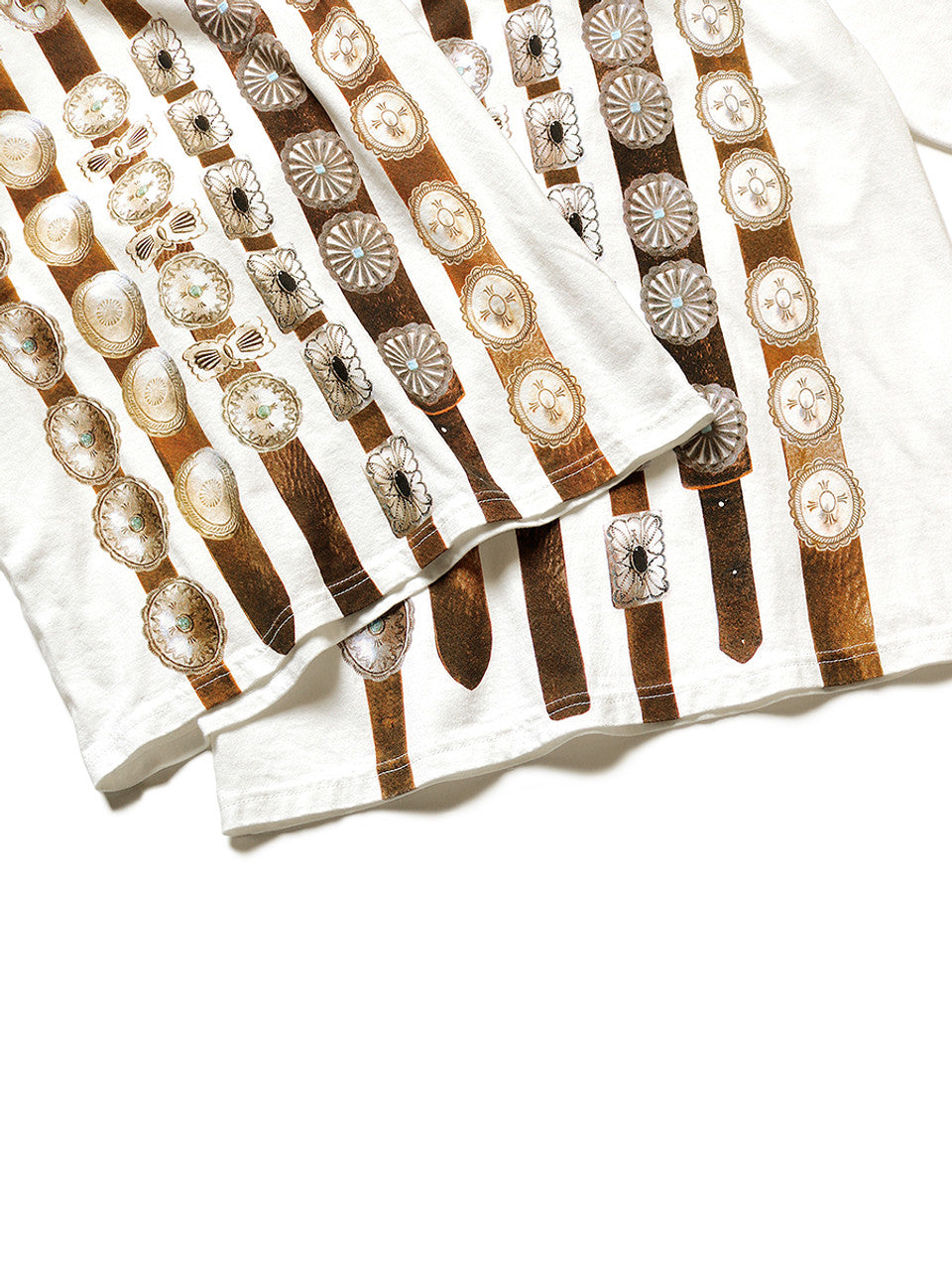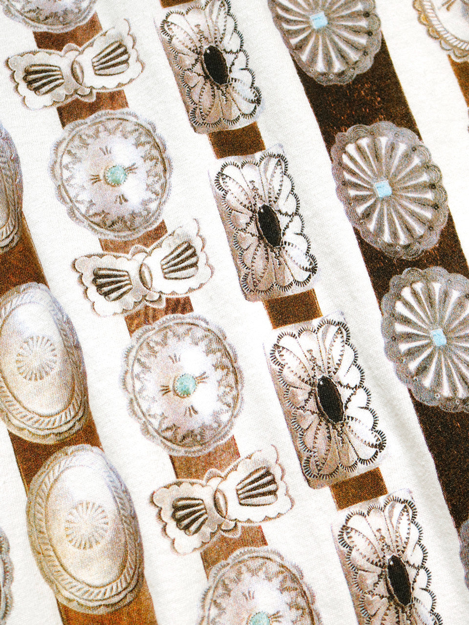 A long sleeved t-shirt printed with vintage concho belts lined up like a curtain.