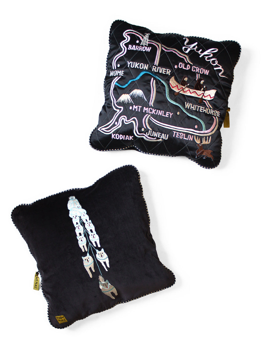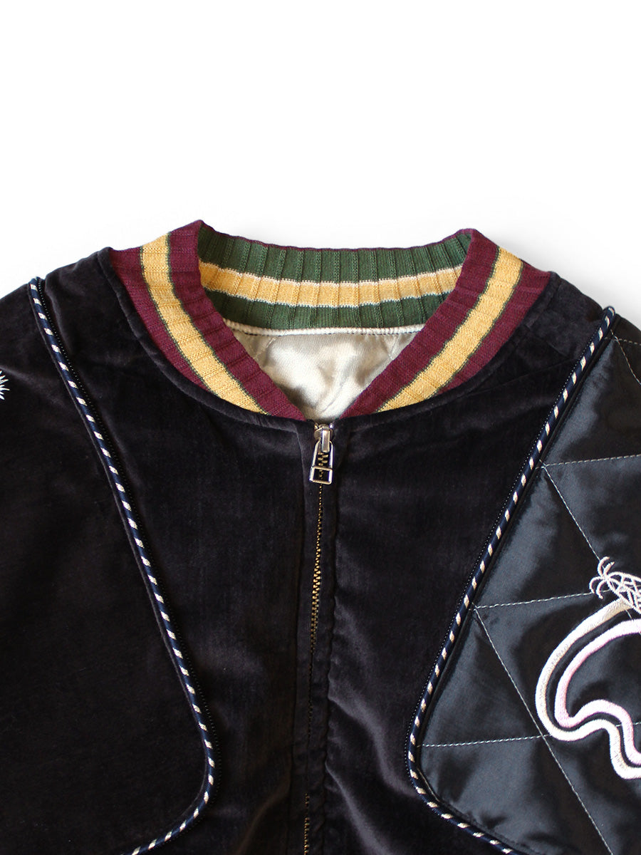 This bomber jacket is crafted from shiny velveteen. It is a functional piece that can be transformed from a jacket to a pillow. The shoulder area is embroidered and becomes the front of the pillow.