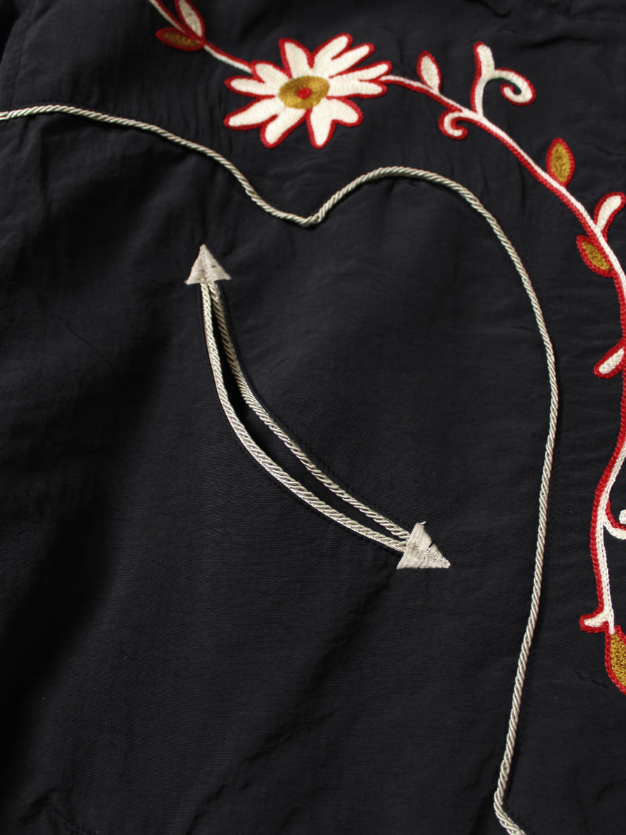 This parka is made from durable yet lightweight nylon taffeta. The lining is made of mesh material. It features a western shirt-style fabric and floral embroidery. The collar and hem adjusters allow you to create a variety of silhouettes.