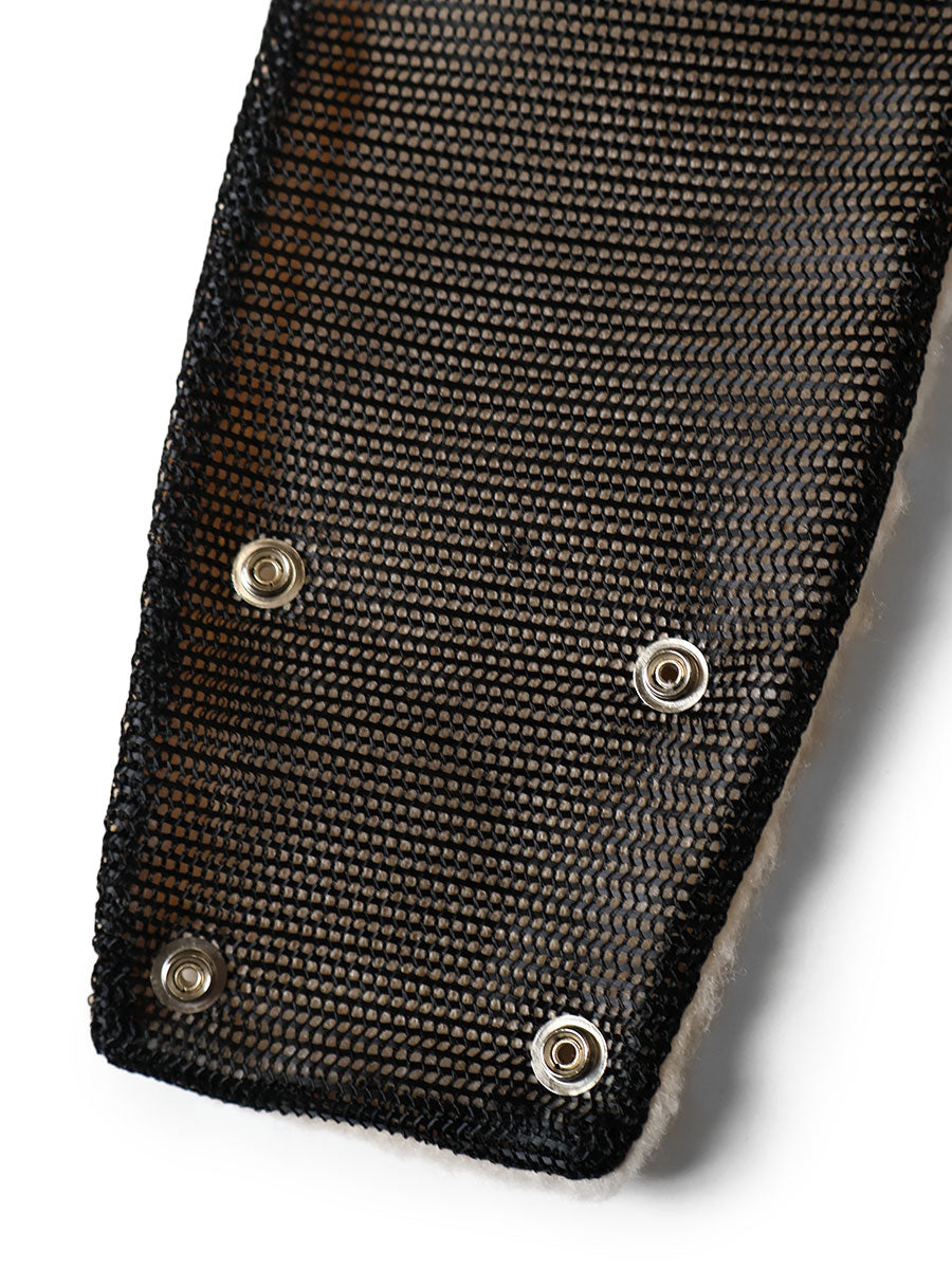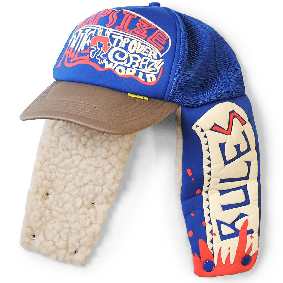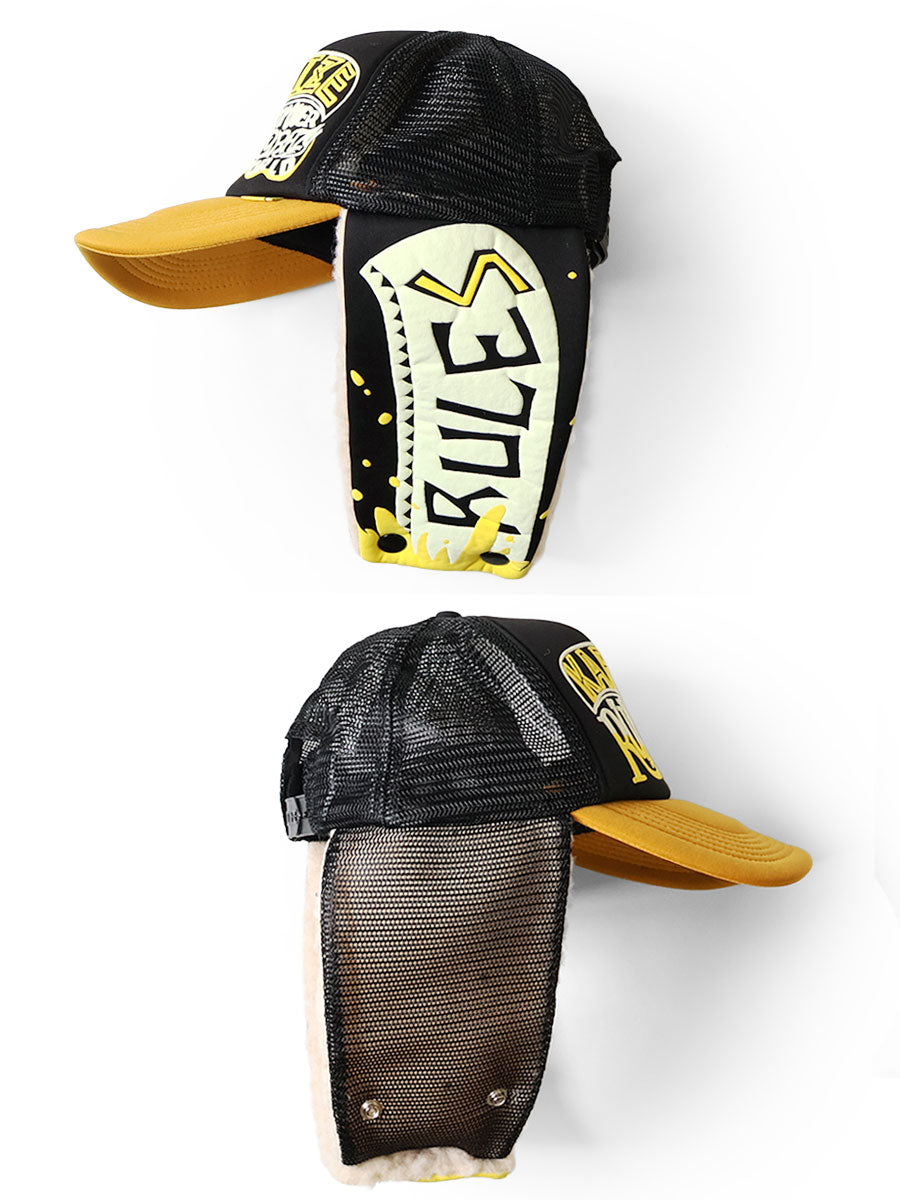 This trucker cap features earflaps made of boa material. The outside of the earflaps has a different design on each side, with a print on the left and a mesh material on the right. The earflaps have buttons so they can be fastened either on top of the head or under the chin.