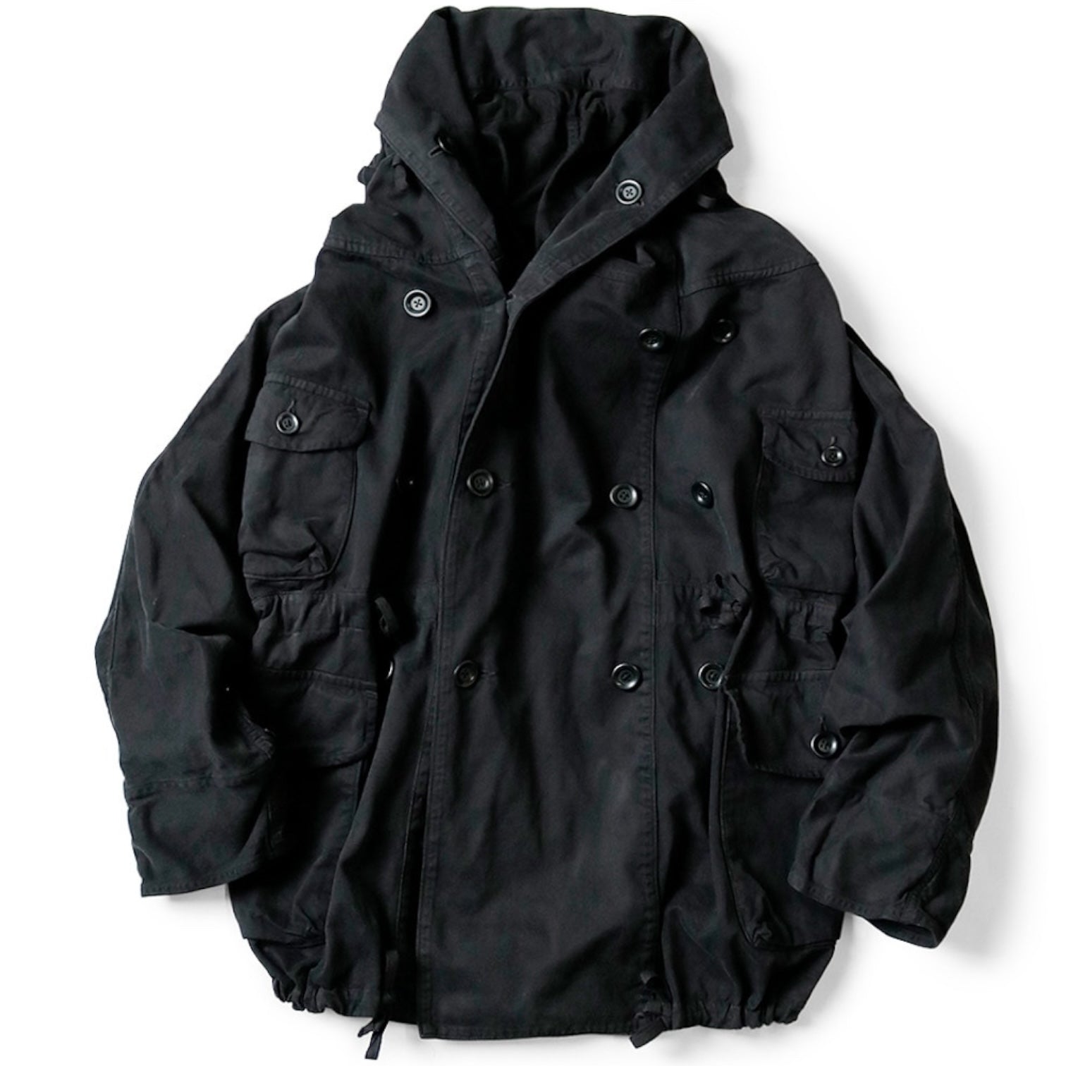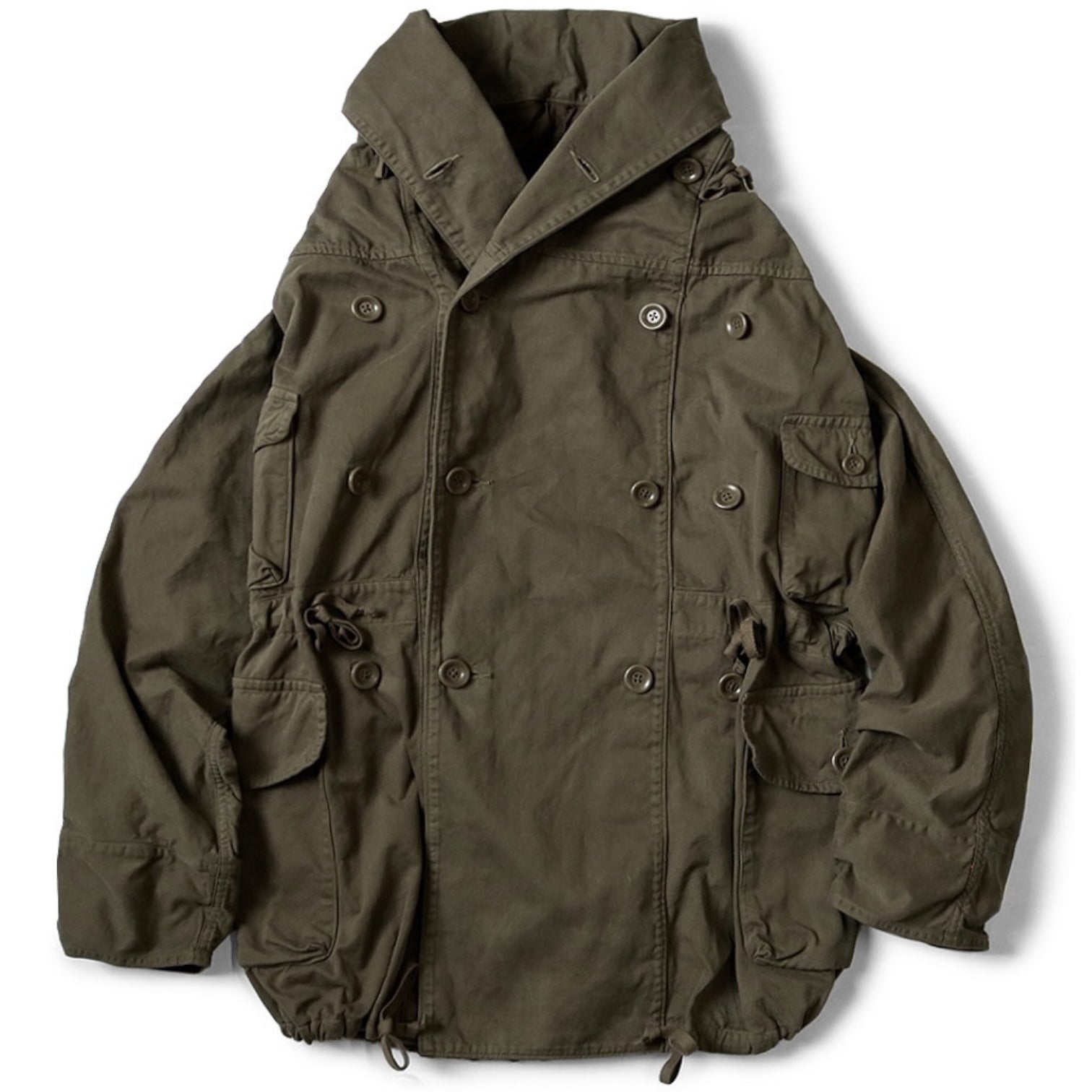 This ring coat has lots of buttons and a bib on the front, allowing you to enjoy wearing it in a variety of ways. It has a voluminous silhouette and the waist can be adjusted with a drawstring. It is made of brushed Katsuragi fabric, which has a soft texture and feel.