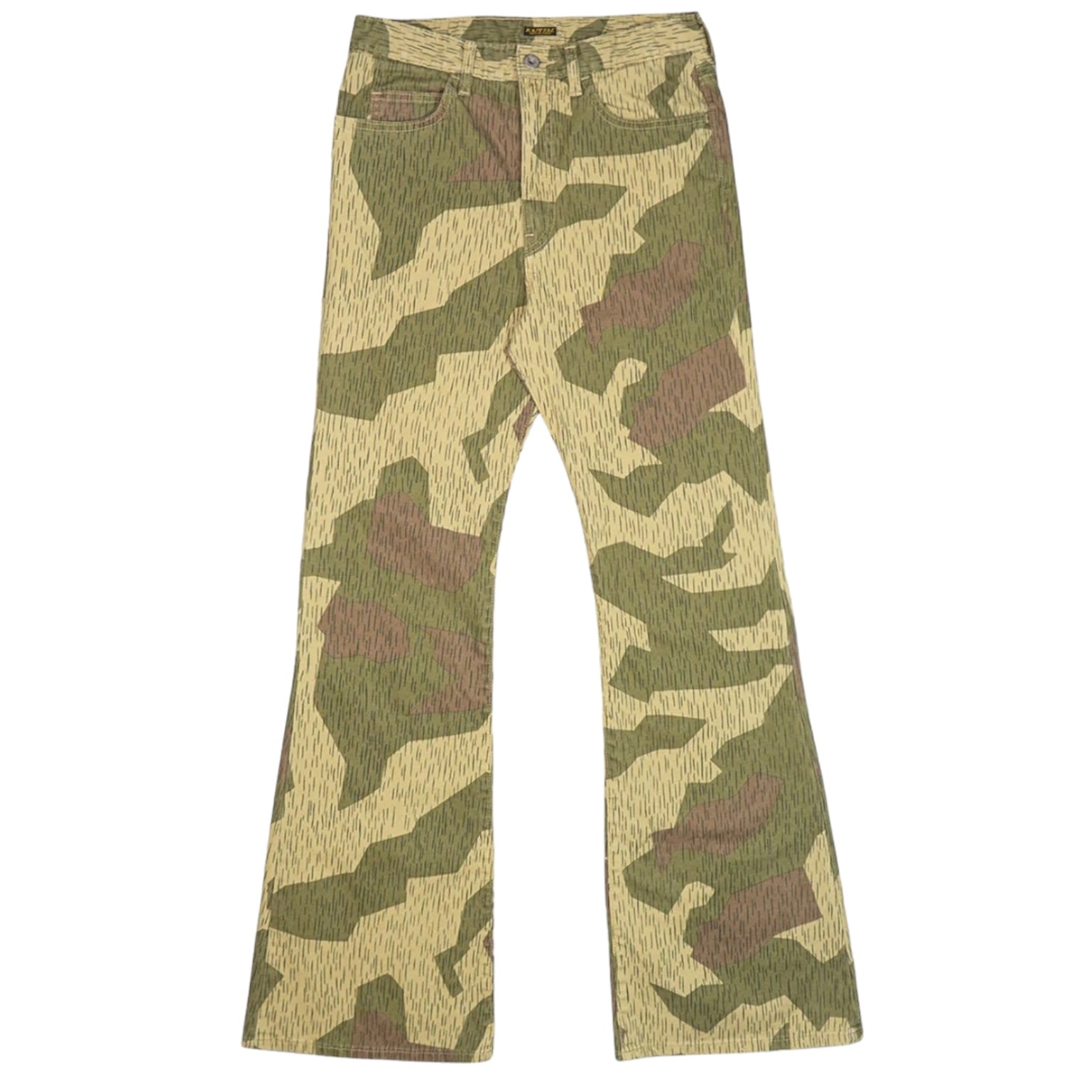OKABELLBO features a deep flared silhouette at the rise. It uses lightweight fabric that has a printed rain camo effect.
