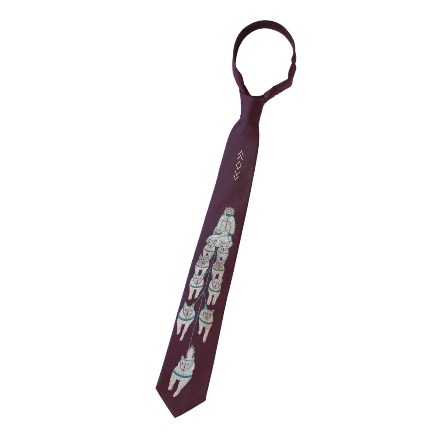 This tie features a dog sled design, similar to that used on souvenir jackets. It is made of silk, which has an elegant luster and a smooth feel.