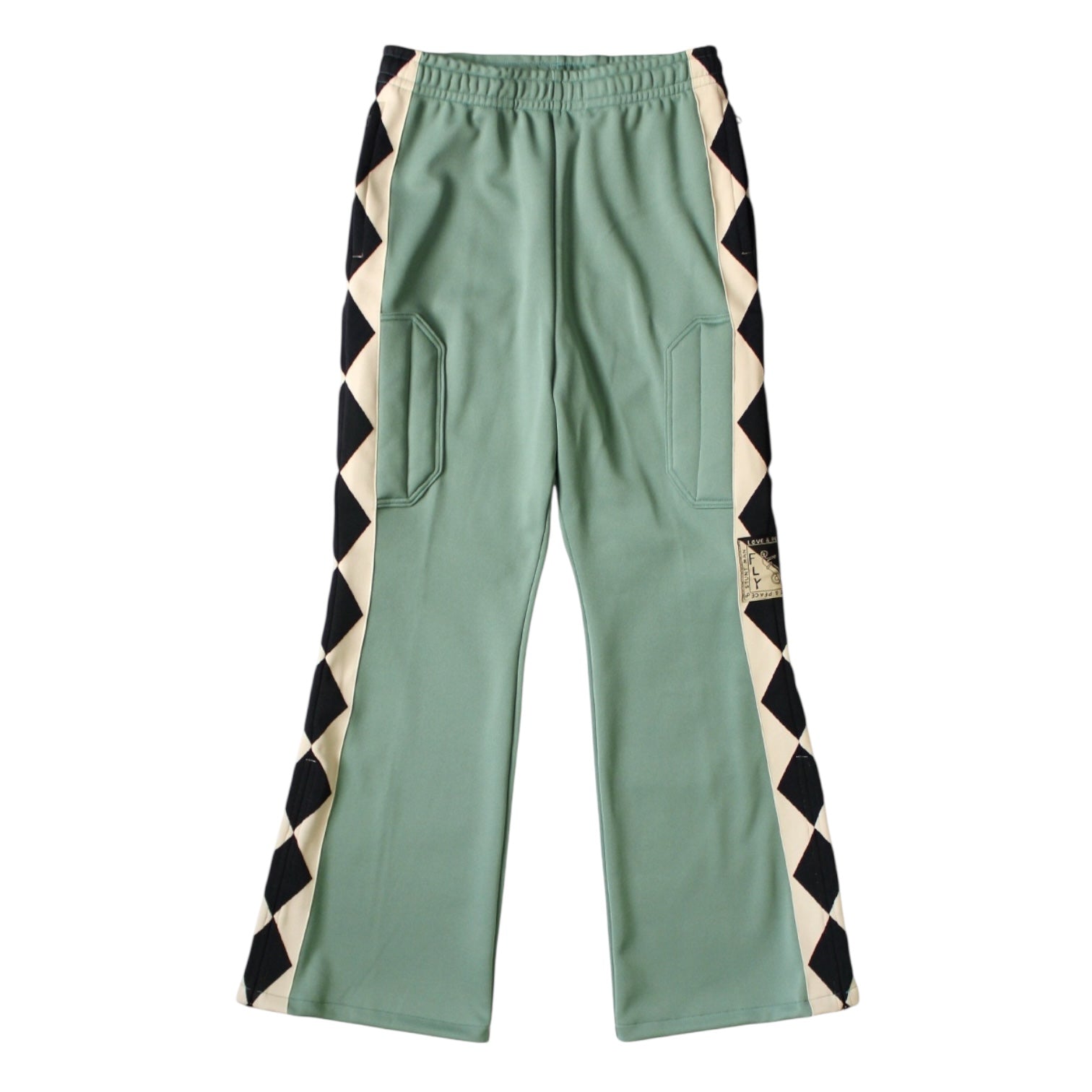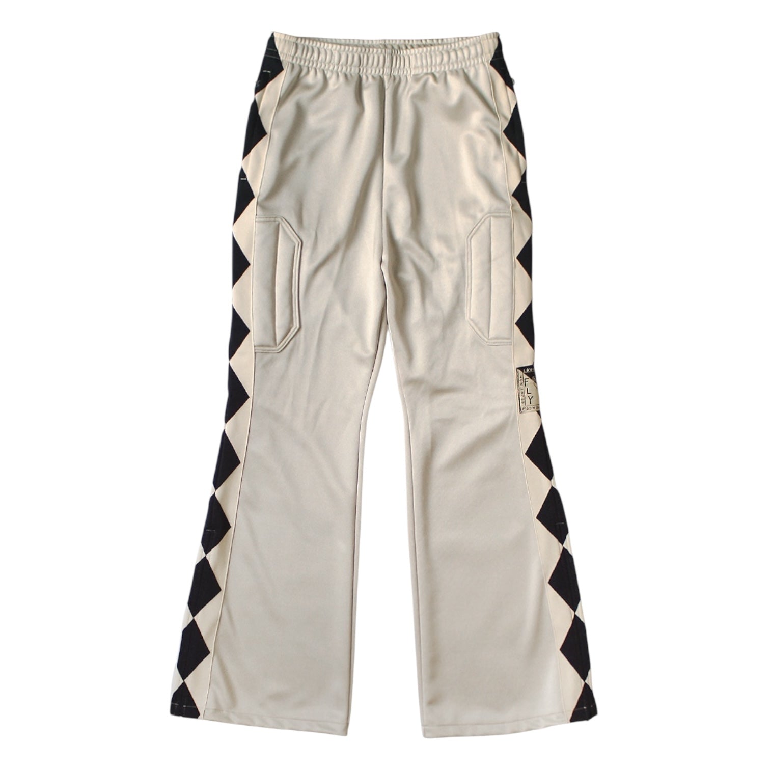 These track pants feature a checkered flag pattern on the side tape. They are made from a smooth jersey fabric. They have a clean, flared silhouette with a zippered hem. The thighs are padded with a comfortable filling material. The waist has an elasticated waistband and a drawcord.