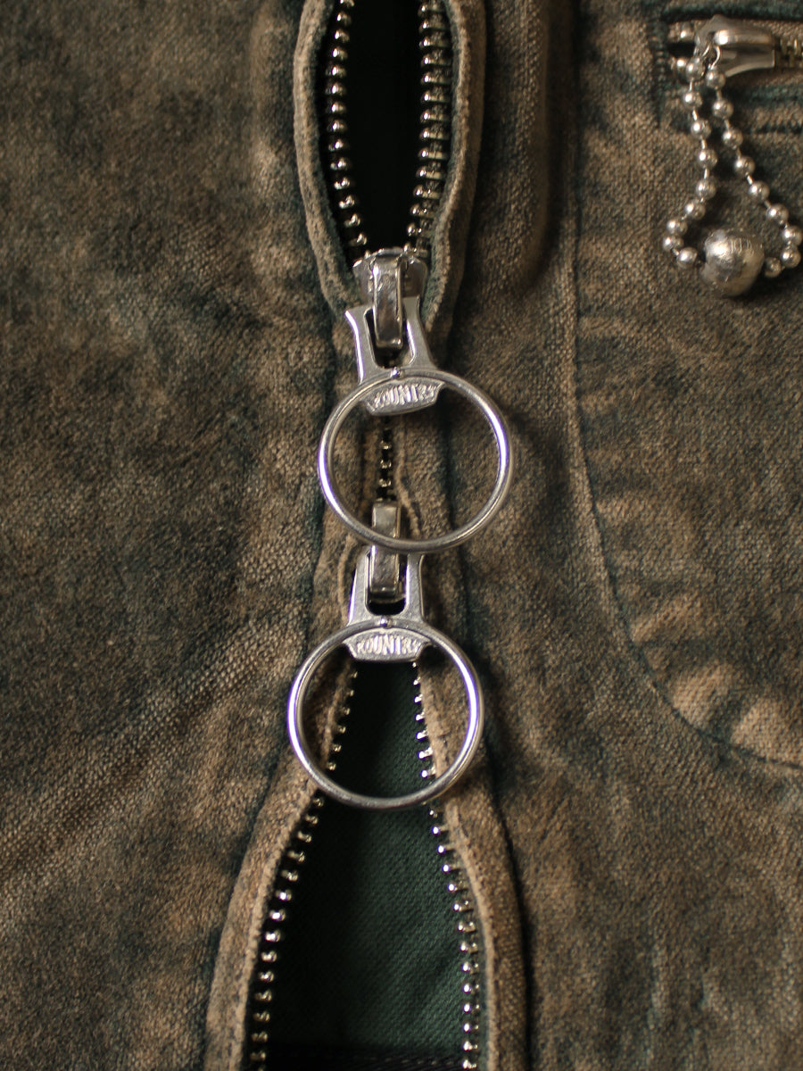 This drizzler jacket is made from unevenly dyed velveteen fabric. It's half-lined with cupra fabric. The front has a double zipper. The action pleats allow for easy movement.